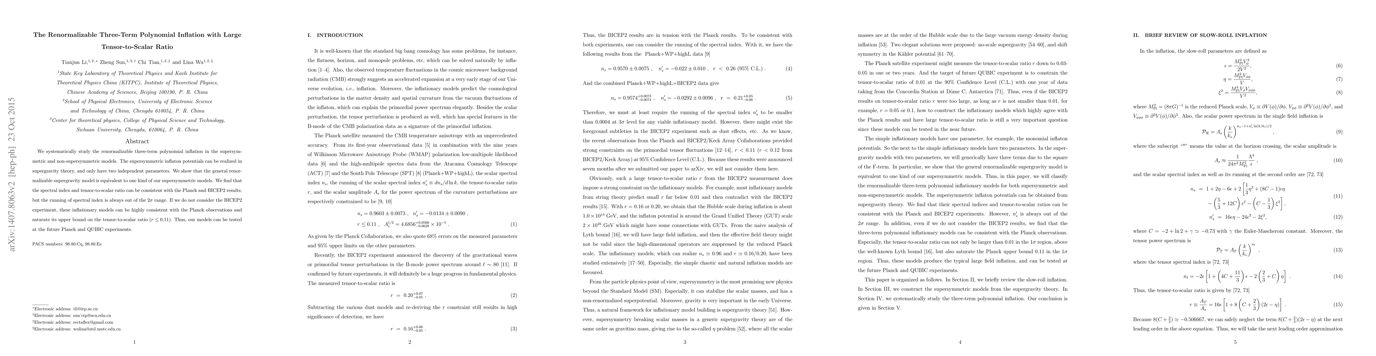Research paper investigates renormalizable three-term polynomial inflation models with large tensor-to-scalar ratio, finding consistency with Planck results but not within $2 au$ range for spectral index running.