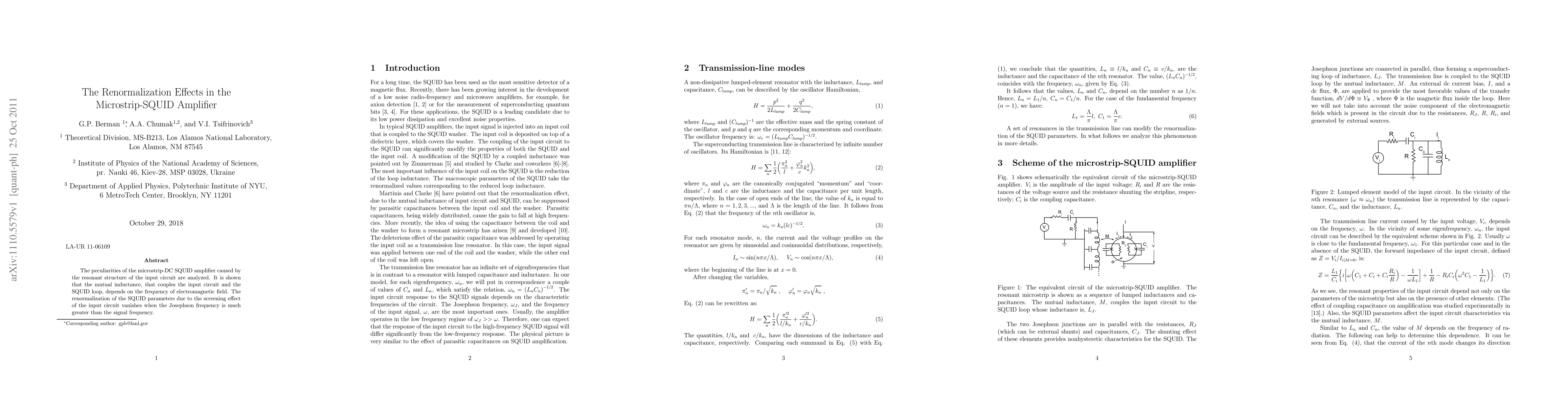 This paper analyzes the unique behaviors of microstrip-DC SQUID amplifiers due to their resonant input circuit, revealing that mutual inductance between the input circuit and SQUID loop varies with electromagnetic field frequency. The study concludes that the renormalization of SQUID parameters due to the input circuit's screening effect diminishes when the Josephson frequency exceeds the signal frequency.