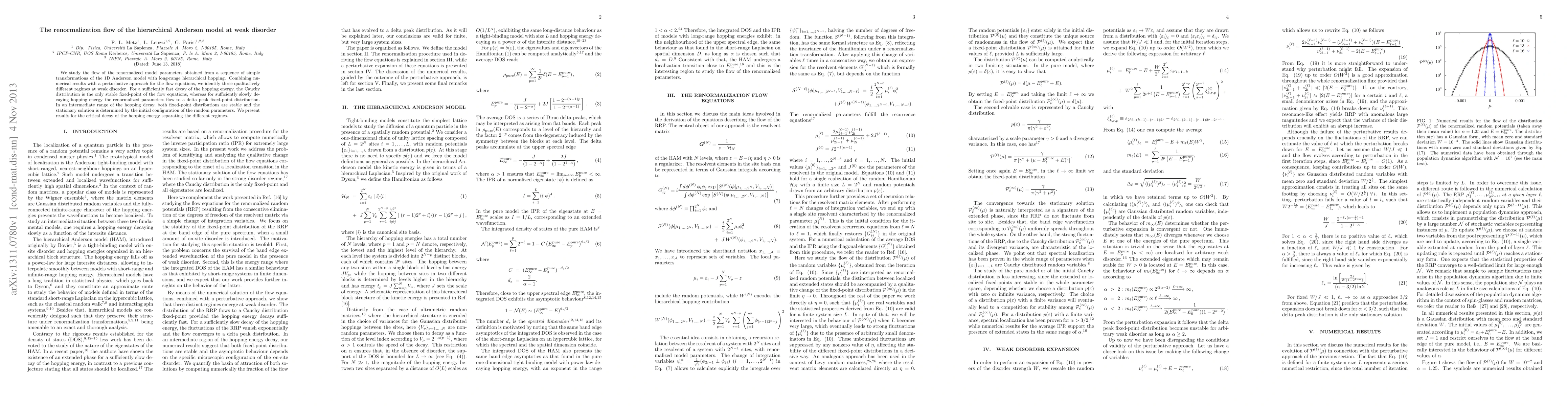 We study the flow of the renormalized model parameters obtained from a sequence of simple transformations of the 1D Anderson model with long-range hierarchical hopping. Combining numerical results with a perturbative approach for the flow equations, we identify three qualitatively different regimes at weak disorder. For a sufficiently fast decay of the hopping energy, the Cauchy distribution is the only stable fixed-point of the flow equations, whereas for sufficiently slowly decaying hopping energy the renormalized parameters flow to a delta peak fixed-point distribution. In an intermediate range of the hopping decay, both fixed-point distributions are stable and the stationary solution is determined by the initial configuration of the random parameters. We present results for the critical decay of the hopping energy separating the different regimes.