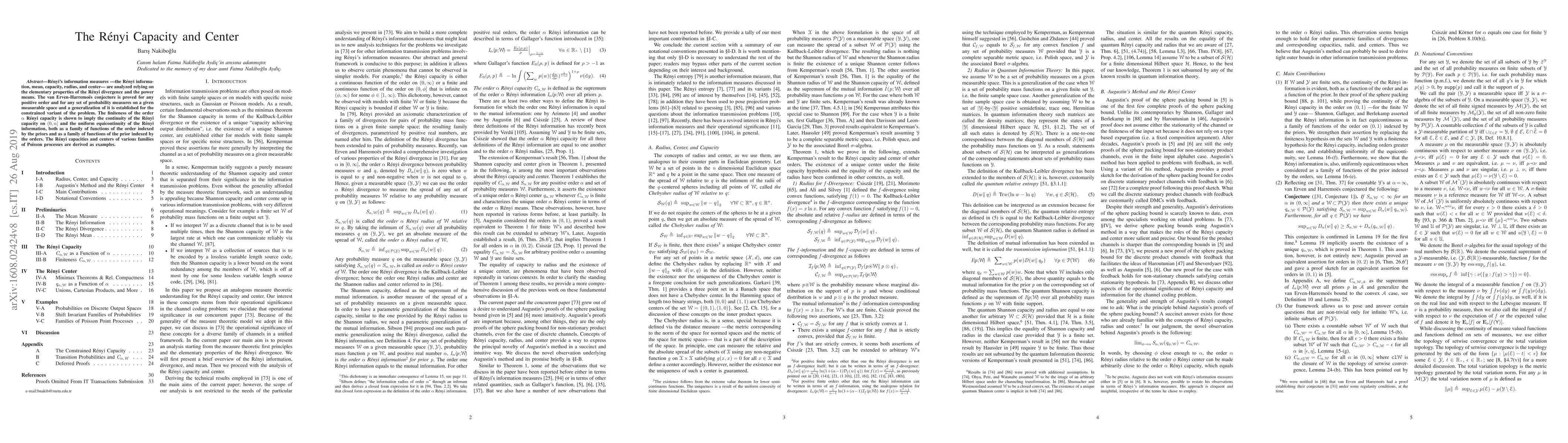 Renyi's information measures ---the Renyi information, mean, capacity, radius, and center--- are analyzed relying on the elementary properties of the Renyi divergence and the power means. The van Erven-Harremoes conjecture is proved for any positive order and for any set of probability measures on a given measurable space and a generalization of it is established for the constrained variant of the problem. The finiteness of the order $\alpha$ Renyi capacity is shown to imply the continuity of the Renyi capacity on $(0,\alpha]$ and the uniform equicontinuity of the Renyi information, both as a family of functions of the order indexed by the priors and as a family of functions of the prior indexed by the orders. The Renyi capacities and centers of various families of Poisson processes are derived as examples.