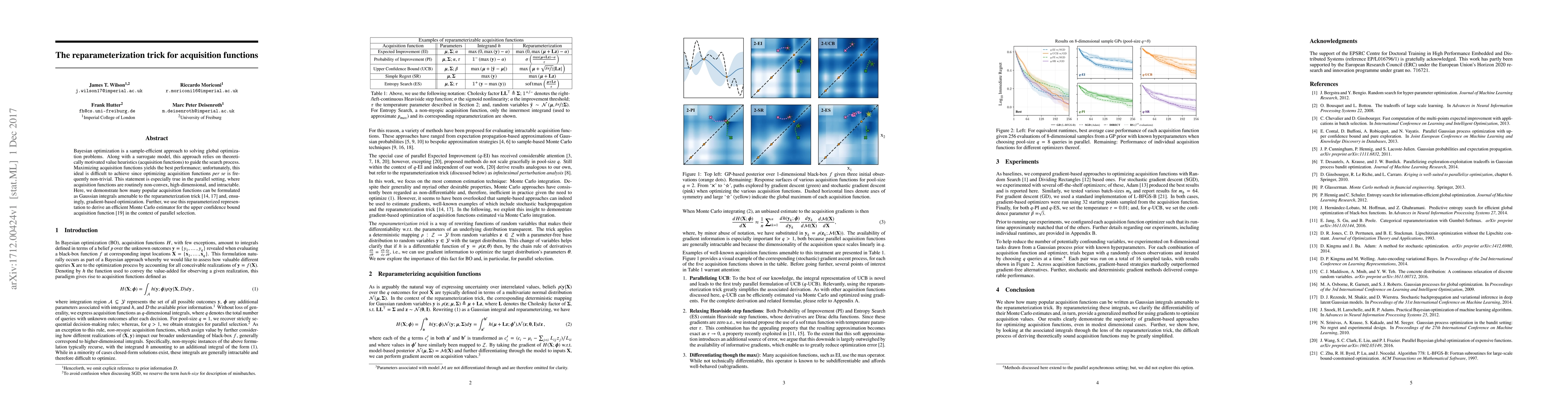 This paper proposes using the reparameterization trick to optimize acquisition functions in Bayesian optimization, transforming them into Gaussian integrals suitable for gradient-based methods. It also develops an efficient Monte Carlo estimator for the upper confidence bound acquisition function in parallel settings.