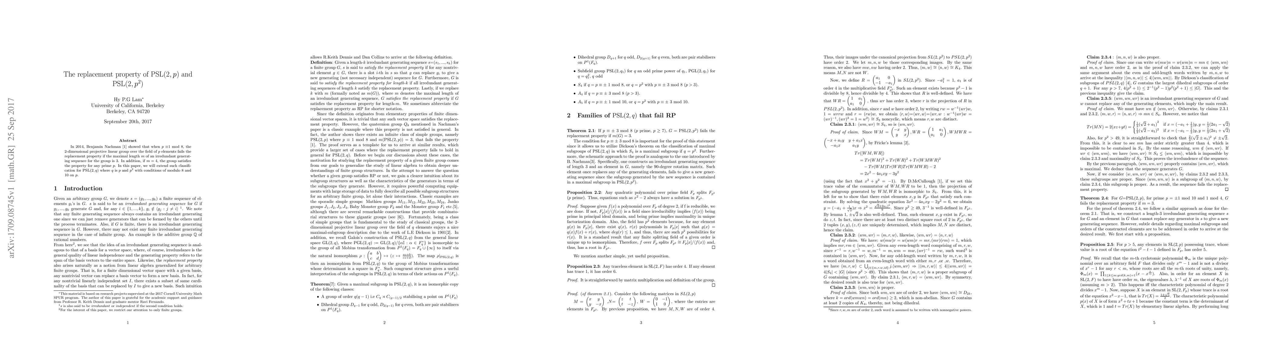 In 2014, Benjamin Nachman showed that when $p\equiv$1 mod 8, the 2-dimensional projective linear group over the field of $p$ elements fails the replacement property if the maximal length $m$ of an irredundant generating sequence for the group is 3. In addition, if $m=4$, the group satisfies the property for any prime $p$. In this paper, we will extend such classification for PSL$(2,q)$ where $q$ is $p$ and $p^2$ with conditions of modulo 8 and 10 on $p$.