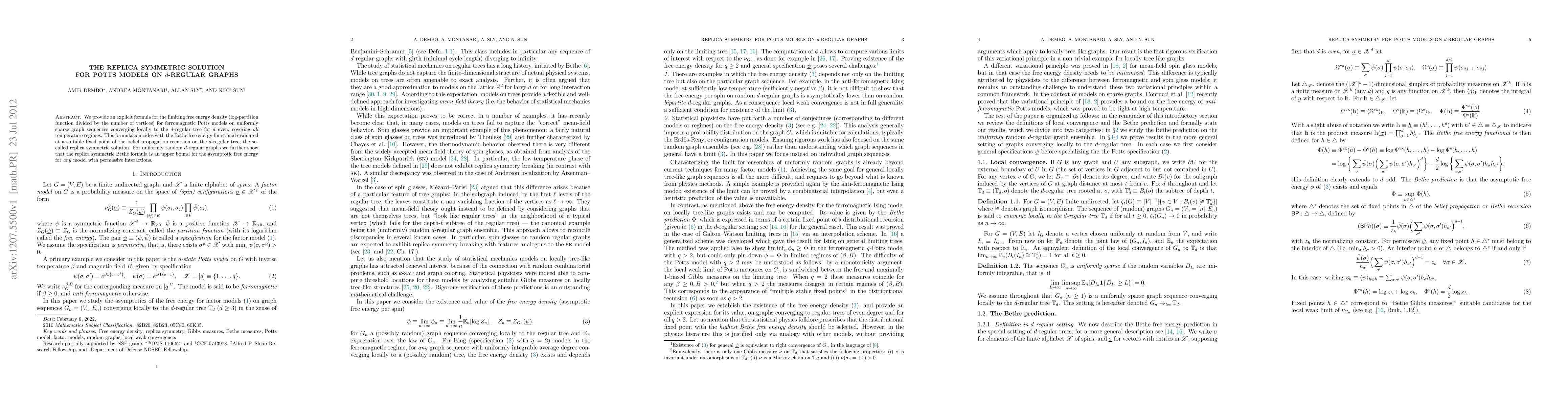 This paper derives an explicit formula for the limiting free energy density of Potts models on d-regular graphs, showing it matches the Bethe free energy functional on the d-regular tree. It also proves that this replica symmetric Bethe formula is an upper bound for the asymptotic free energy on uniformly random d-regular graphs.