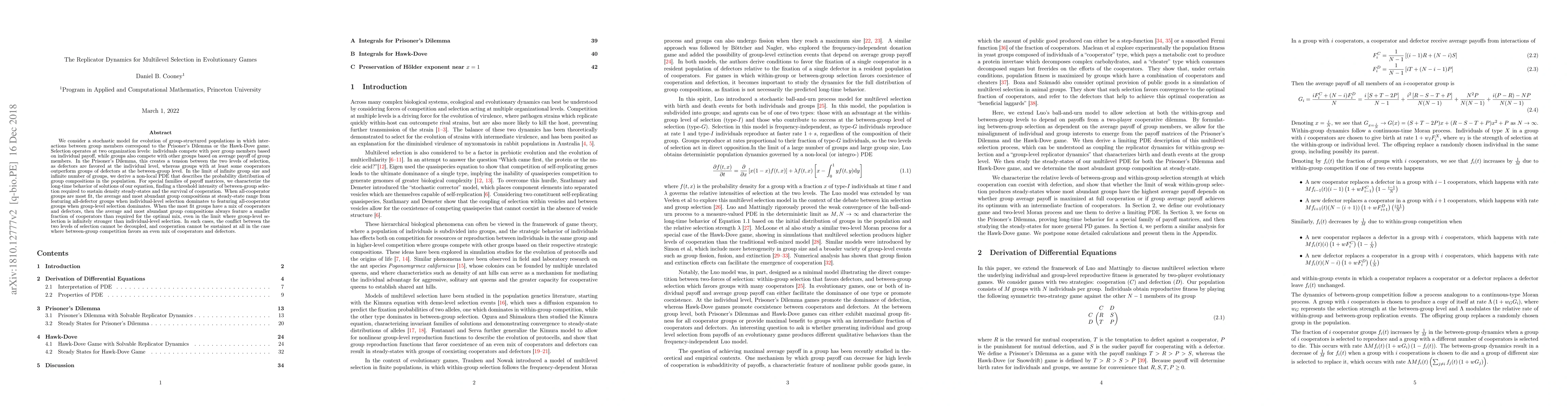 We consider a stochastic model for evolution of group-structured populations in which interactions between group members correspond to the Prisoner's Dilemma or the Hawk-Dove game. Selection operates at two organization levels: individuals compete with peer group members based on individual payoff, while groups also compete with other groups based on average payoff of group members. In the Prisoner's Dilemma, this creates a tension between the two levels of selection, as defectors are favored at the individual level, whereas groups with at least some cooperators outperform groups of defectors at the between-group level. In the limit of infinite group size and infinite number of groups, we derive a non-local PDE that describes the probability distribution of group compositions in the population. For special families of payoff matrices, we characterize the long-time behavior of solutions of our equation, finding a threshold level of between-group selection required to sustain density steady states and the survival of cooperation. When all-cooperator groups are most fit, the average and most abundant group composition at steady state range from featuring all-defector groups when individual-level selection dominates to featuring all-cooperator groups when group-level selection dominates. When the most fit groups have a mix of cooperators and defectors, then the average and most abundant group compositions always feature a smaller fraction of cooperators than required for the optimal mix, even in the limit where group-level selection is infinitely stronger than individual-level selection. In such cases, the conflict between the two levels of selection cannot be decoupled, and cooperation cannot be sustained at all in the case when between-group competition favors an even mix of cooperators and defectors.