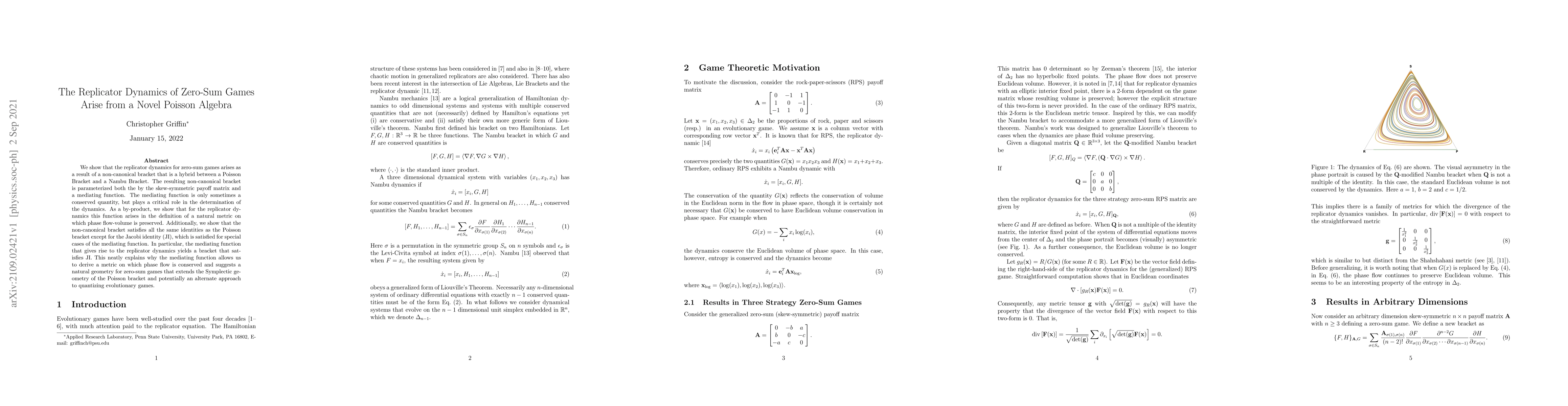 Researchers discovered a novel Poisson algebra that explains the replicator dynamics of zero-sum games, introducing a new metric for phase flow-volume preservation and an alternative approach to quantizing evolutionary games.