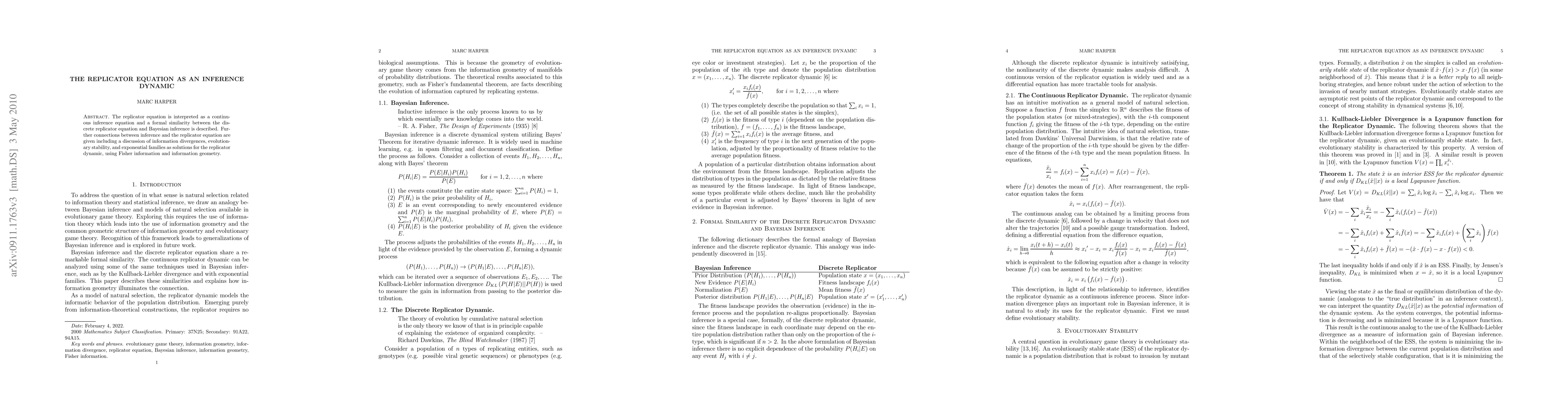 The replicator equation is reinterpreted as a continuous inference dynamic, drawing parallels between it and Bayesian inference, and exploring connections through information divergences and solutions from Fisher information and information geometry.