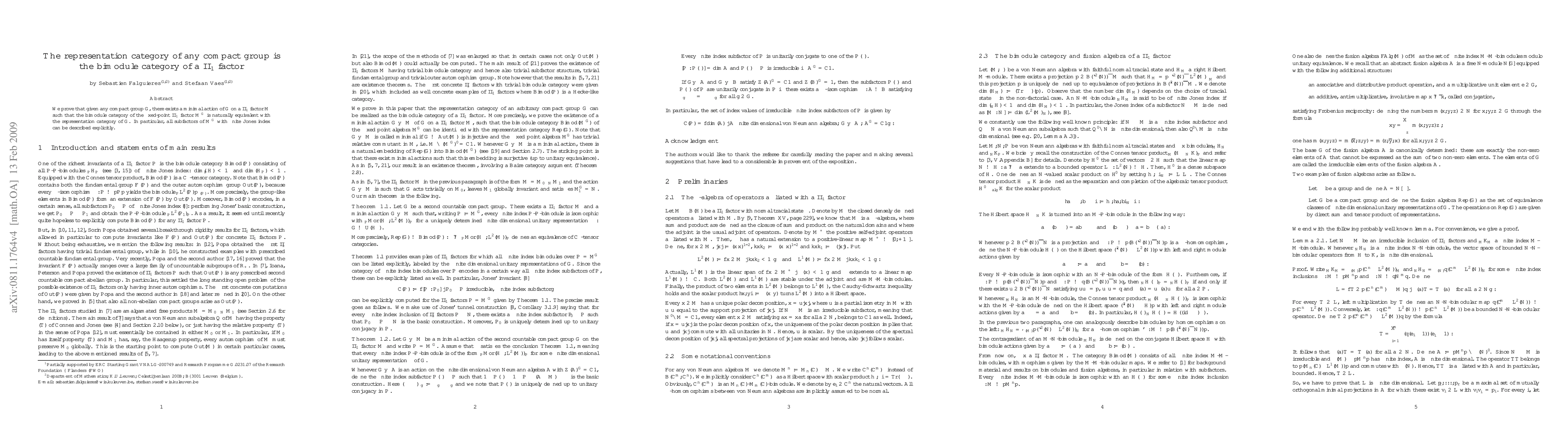 The paper proves that the representation category of any compact group G is naturally equivalent to the bimodule category of a II_1 factor M, where M is a fixed-point subfactor under a minimal action of G. This establishes a clear connection between group representations and subfactors within II_1 factors.