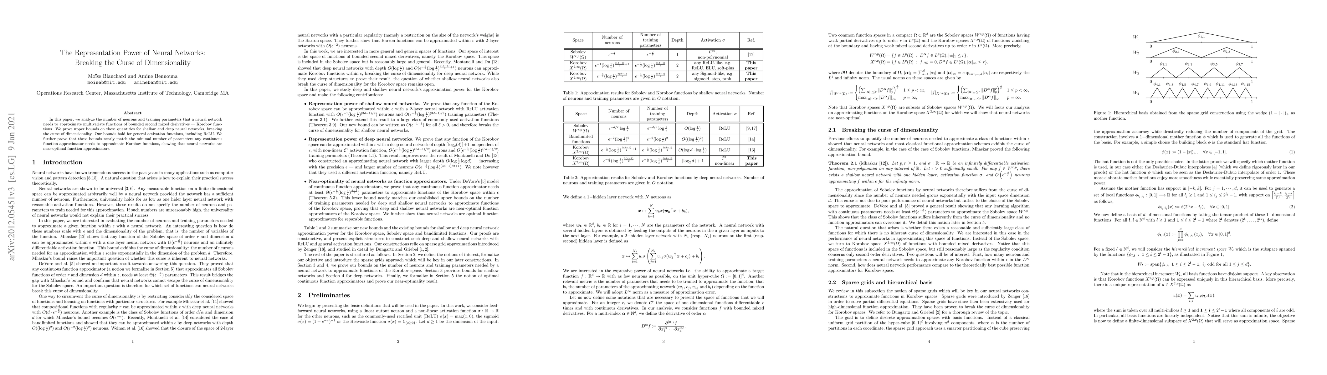 In this paper, we analyze the number of neurons and training parameters that a neural networks needs to approximate multivariate functions of bounded second mixed derivatives -- Korobov functions. We prove upper bounds on these quantities for shallow and deep neural networks, breaking the curse of dimensionality. Our bounds hold for general activation functions, including ReLU. We further prove that these bounds nearly match the minimal number of parameters any continuous function approximator needs to approximate Korobov functions, showing that neural networks are near-optimal function approximators.