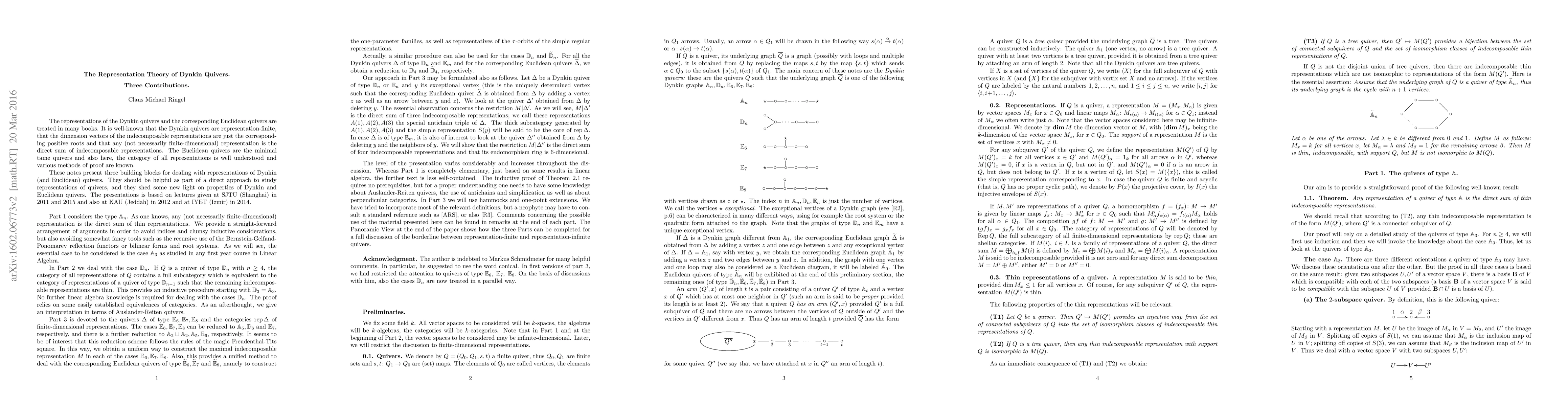 These notes provide three contributions to the (well-established) representation theory of Dynkin and Euclidean quivers. They should be helpful as part of a direct approach to study representations of quivers, and they may shed some new light on properties of Dynkin and Euclidean quivers. Part 1 deals with the case A (see arXiv:1304.5720). Part 2 concerns the case D. We show that the category of representation of D_n contains a full subcategory which is equivalent to the category of representations of a quiver of type D_{n-1} such that the remaining indecomposable representations are thin. This suggests an inductive procedure to deal with the D-cases, starting with D_3 = A_3. Part 3 deals with the cases E. It provides a uniform way to construct the maximal indecomposable representation for these Dynkin quivers as well as a unified method to deal with the corresponding Euclidean quivers. The level of the presentation varies considerably and increases throughout the discussion. Whereas Part 1 is completely elementary, just based on some results in linear algebra, the further text is less self-contained and uses one-point extensions, simplification, perpendicular categories, Auslander-Reiten quivers and hammocks.
