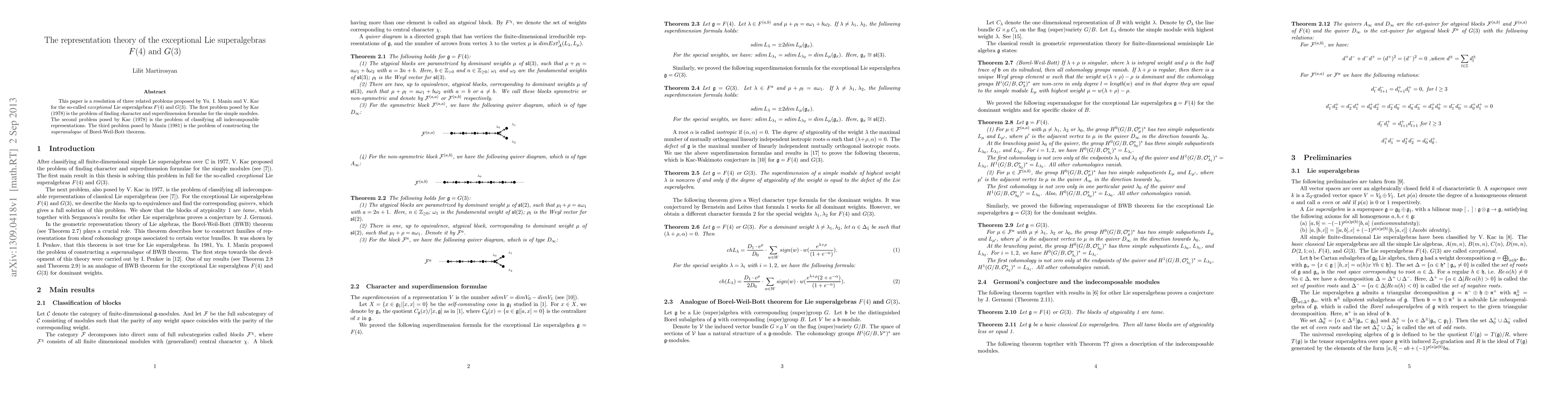 This paper is a resolution of three related problems proposed by Yu. I. Manin and V. Kac for the so-called {\it{exceptional}} Lie superalgebras F(4) and G(3). The first problem posed by Kac (1978) is the problem of finding character and superdimension formulae for the simple modules. The second problem posed by Kac (1978) is the problem of classifying all indecomposable representations. The third problem posed by Manin (1981) is the problem of constructing the {\it{superanalogue}} of Borel-Weil-Bott theorem.
