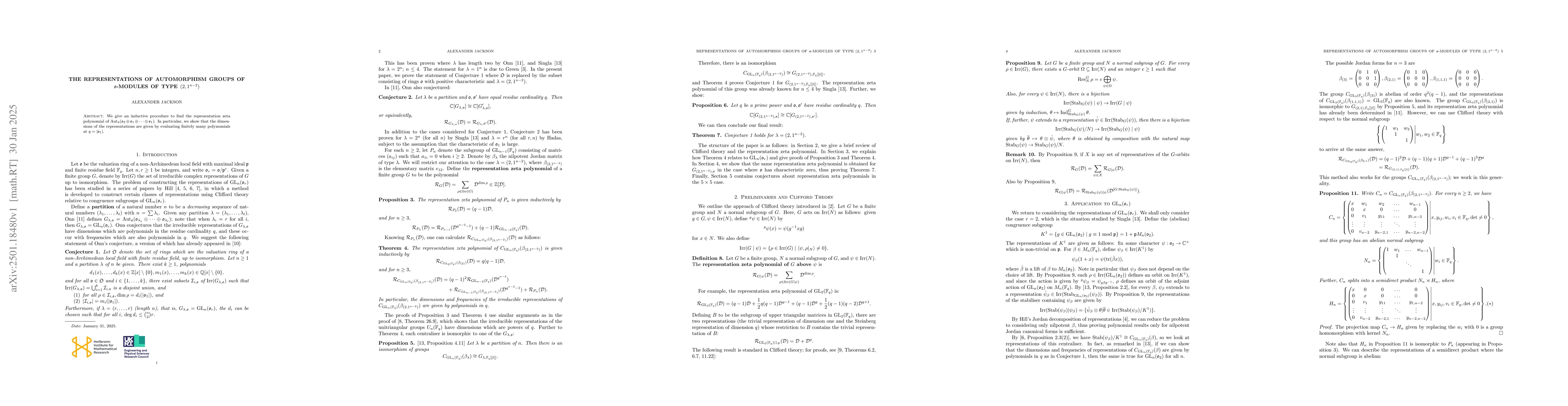 The paper presents an inductive procedure to find the representation zeta polynomial of \(\mathrm{Aut}_{\mathfrak{o}}(\mathfrak{o}_2 \oplus \mathfrak{o}_1 \oplus \dots \oplus \mathfrak{o}_1)\), demonstrating that dimensions of representations can be determined by evaluating finitely many polynomials at \(q = |\mathfrak{o}_1|\).