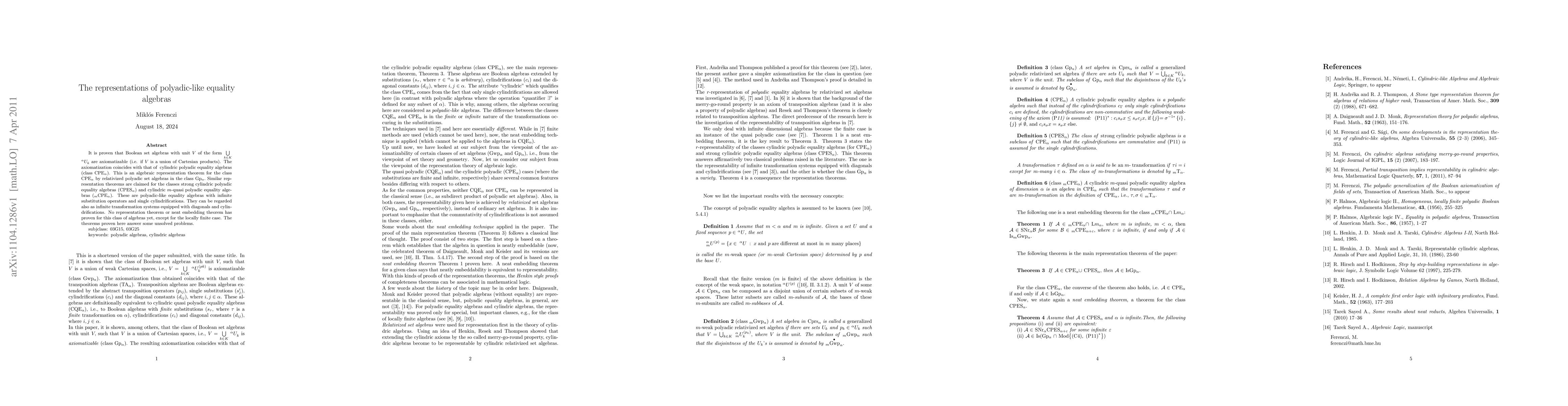 The paper presents an algebraic representation theorem showing Boolean set algebras with unit V can be axiomatized similarly to cylindric polyadic equality algebras. It also claims representation theorems for strong cylindric and cylindric m-quasi polyadic equality algebras, addressing previously unsolved problems in this area.