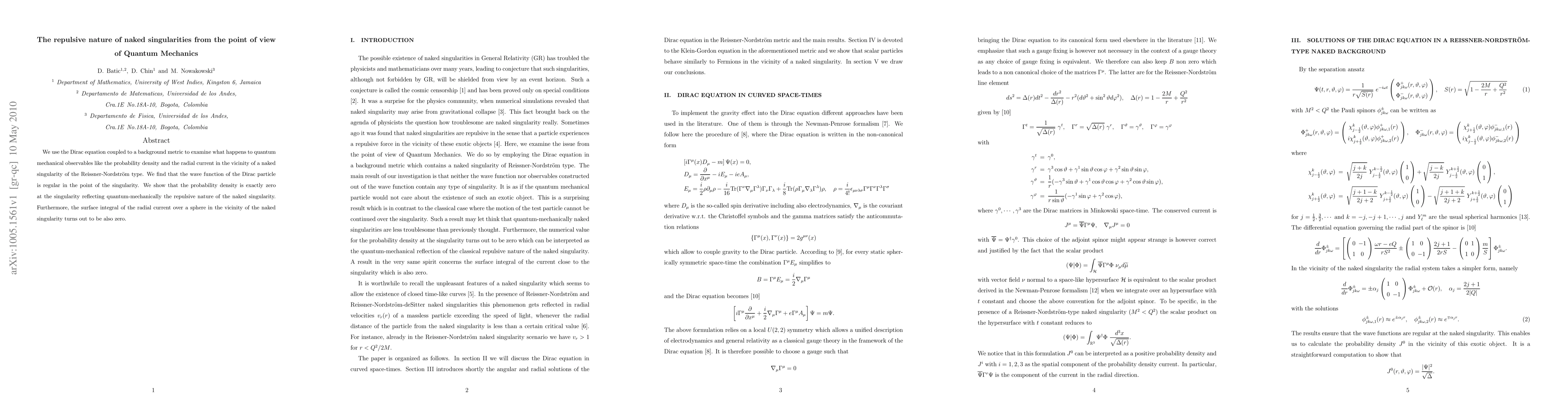 We use the Dirac equation coupled to a background metric to examine what happens to quantum mechanical observables like the probability density and the radial current in the vicinity of a naked singularity of the Reissner-Nordstr\"{o}m type. We find that the wave function of the Dirac particle is regular in the point of the singularity. We show that the probability density is exactly zero at the singularity reflecting quantum-mechanically the repulsive nature of the naked singularity. Furthermore, the surface integral of the radial current over a sphere in the vicinity of the naked singularity turns out to be also zero.
