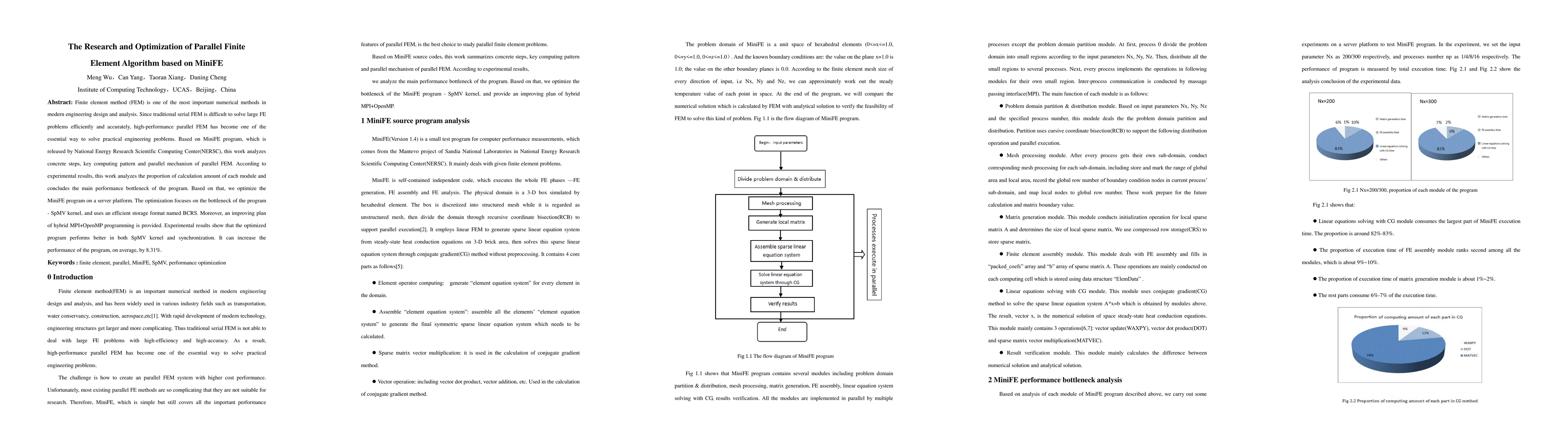 Finite element method (FEM) is one of the most important numerical methods in modern engineering design and analysis. Since traditional serial FEM is difficult to solve large FE problems efficiently and accurately, high-performance parallel FEM has become one of the essential way to solve practical engineering problems. Based on MiniFE program, which is released by National Energy Research Scientific Computing Center(NERSC), this work analyzes concrete steps, key computing pattern and parallel mechanism of parallel FEM. According to experimental results, this work analyzes the proportion of calculation amount of each module and concludes the main performance bottleneck of the program. Based on that, we optimize the MiniFE program on a server platform. The optimization focuses on the bottleneck of the program - SpMV kernel, and uses an efficient storage format named BCRS. Moreover, an improving plan of hybrid MPI+OpenMP programming is provided. Experimental results show that the optimized program performs better in both SpMV kernel and synchronization. It can increase the performance of the program, on average, by 8.31%. Keywords : finite element, parallel, MiniFE, SpMV, performance optimization