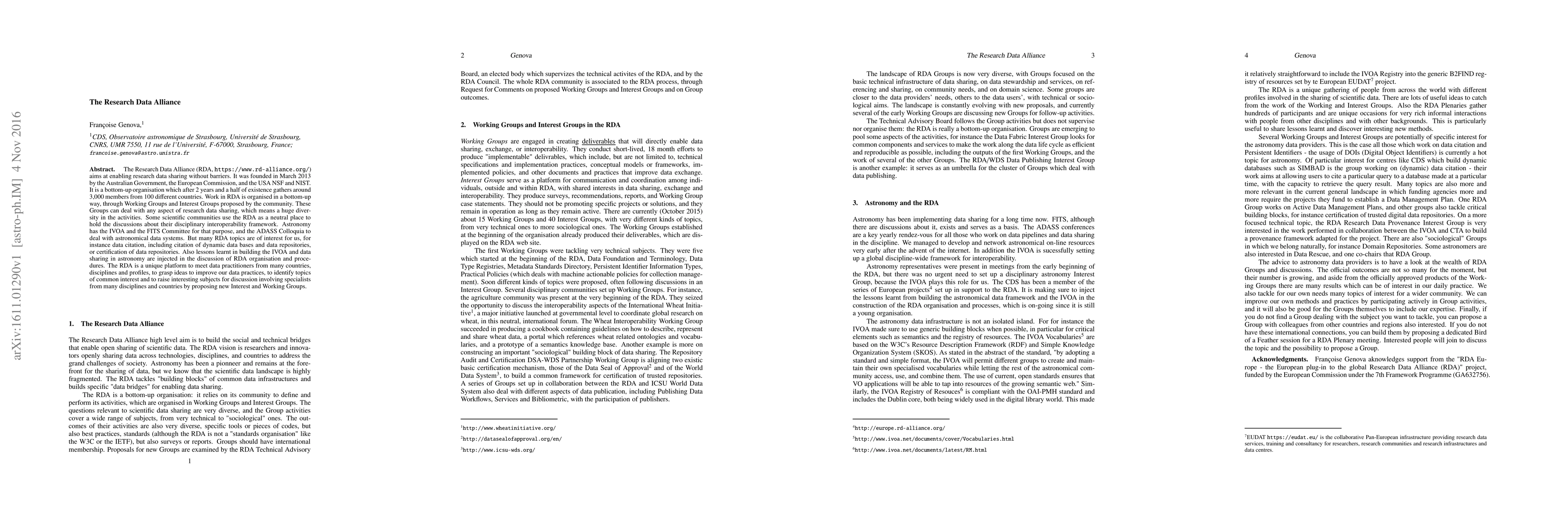 The Research Data Alliance (RDA, https://www.rd-alliance.org/) aims at enabling research data sharing without barriers. It was founded in March 2013 by the Australian Government, the European Commission, and the USA NSF and NIST. It is a bottom-up organisation which after 2 years and a half of existence gathers around 3,000 members from 100 different countries. Work in RDA is organised in a bottom-up way, through Working Groups and Interest Groups proposed by the community. These Groups can deal with any aspect of research data sharing, which means a huge diversity in the activities. Some scientific communities use the RDA as a neutral place to hold the discussions about their disciplinary interoperability framework. Astronomy has the IVOA and the FITS Committee for that purpose, and the ADASS Colloquia to deal with astronomical data systems. But many RDA topics are of interest for us, for instance data citation, including citation of dynamic data bases and data repositories, or certification of data repositories. Also lessons learnt in building the IVOA and data sharing in astronomy are injected in the discussion of RDA organisation and procedures. The RDA is a unique platform to meet data practitioners from many countries, disciplines and profiles, to grasp ideas to improve our data practices, to identify topics of common interest and to raise interesting subjects for discussion involving specialists from many disciplines and countries by proposing new Interest and Working Groups.