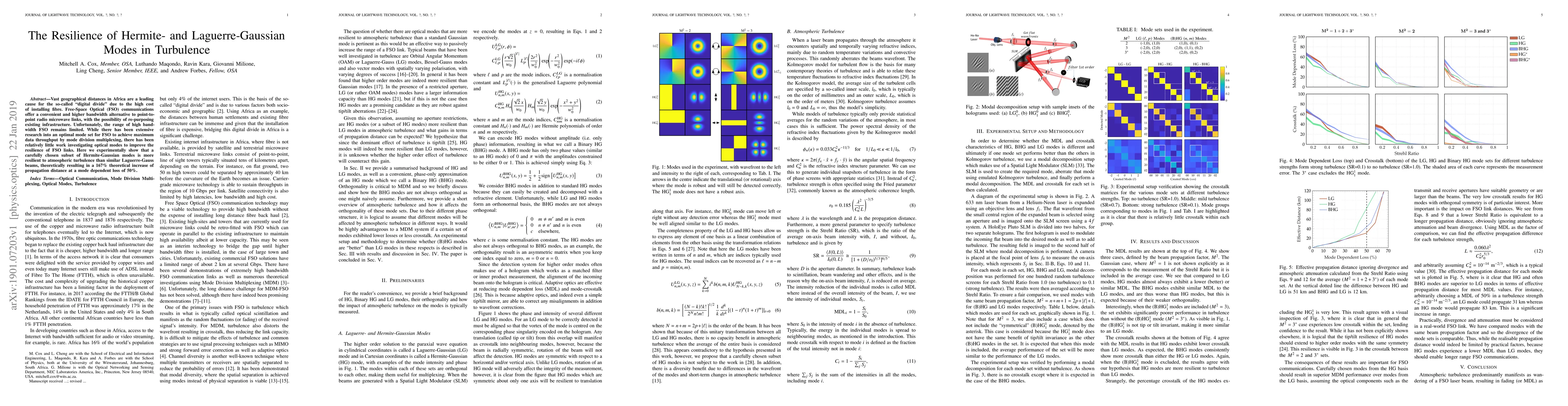 Vast geographical distances in Africa are a leading cause for the so-called "digital divide" due to the high cost of installing fibre. Free-Space Optical (FSO) communications offer a convenient and higher bandwidth alternative to point-to-point radio microwave links, with the possibility of re-purposing existing infrastructure. Unfortunately, the range of high bandwidth FSO remains limited. While there has been extensive research into an optimal mode set for FSO to achieve maximum data throughput by mode division multiplexing, there has been relatively little work investigating optical modes to improve the resilience of FSO links. Here we experimentally show that a carefully chosen subset of Hermite-Gaussian modes is more resilient to atmospheric turbulence than similar Laguerre-Gauss beams, theoretically resulting in a 167% theoretical increase of propagation distance at a mode dependent loss of 50%.