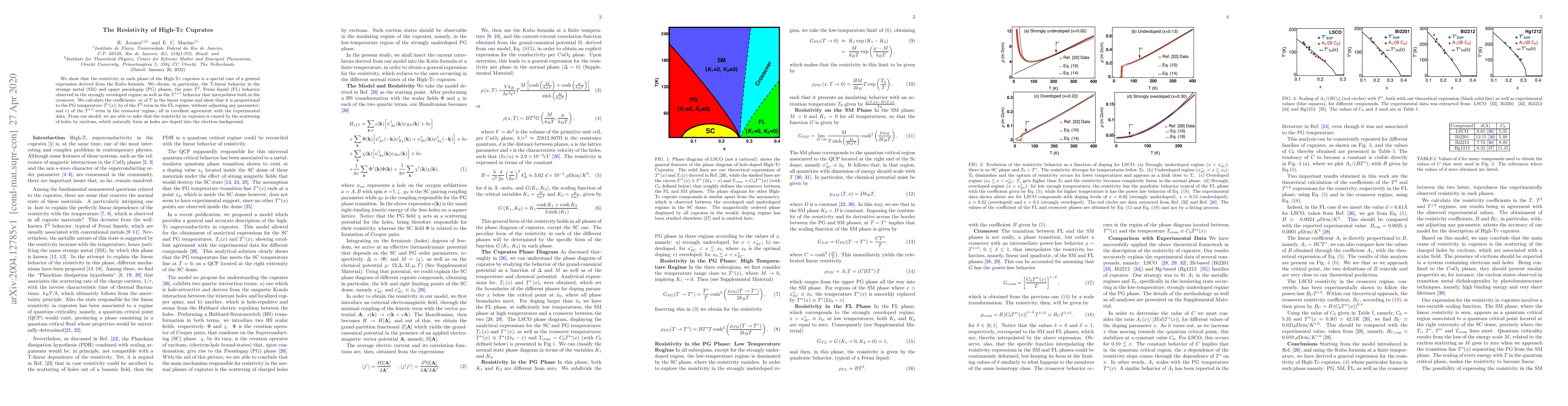 The paper presents a comprehensive theoretical model for resistivity in high-Tc cuprates, deriving a general expression from the Kubo formula and calculating coefficients for different phases, which agree with experimental data.