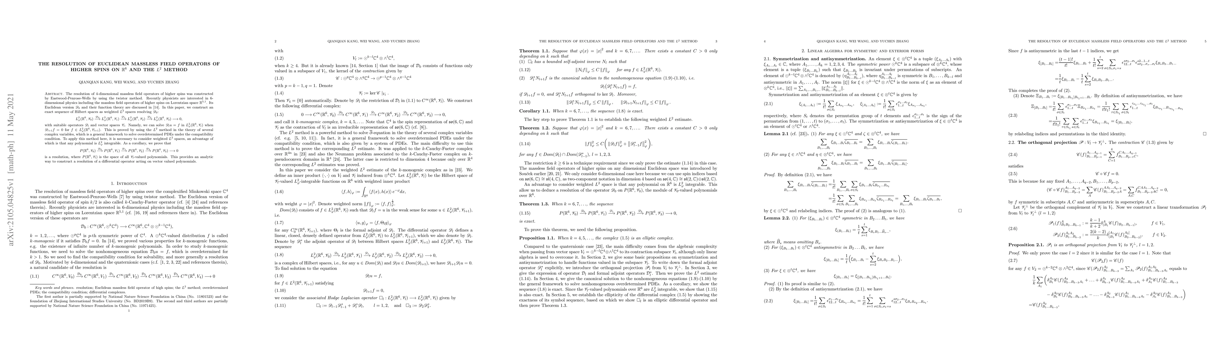 The resolution of $4$-dimensional massless field operators of higher spins was constructed by Eastwood-Penrose-Wells by using the twistor method. Recently physicists are interested in $6$-dimensional physics including the massless field operators of higher spins on Lorentzian space $\Bbb R^{5,1}$. Its Euclidean version $\mathscr{D}_0$ and their function theory are discussed in \cite{wangkang3}. In this paper, we construct an exact sequence of Hilbert spaces as weighted $L^2$ spaces resolving $\mathscr{D}_0$: $$L^2_\varphi(\Bbb R^6, \mathscr{V}_0)\overset{\mathscr{D}_0}\longrightarrow L^2_\varphi(\Bbb R^6,\mathscr{V}_1)\overset{\mathscr{D}_1}\longrightarrow L^2_\varphi(\Bbb R^6, \mathscr{V}_2)\overset{\mathscr{D}_2}\longrightarrow L^2_\varphi(\Bbb R^6, \mathscr{V}_3)\longrightarrow 0,$$ with suitable operators $\mathscr{D}_l$ and vector spaces $\mathscr{V}_l$. Namely, we can solve $\mathscr{D}_{l}u=f$ in $L^2_\varphi(\Bbb R^6, \mathscr{V}_{l})$ when $\mathscr{D}_{l+1} f=0$ for $f\in L^2_{\varphi}(\Bbb R^6, \mathscr{V}_{l+1})$. This is proved by using the $L^2$ method in the theory of several complex variables, which is a general framework to solve overdetermined PDEs under the compatibility condition. To apply this method here, it is necessary to consider weighted $L^2$ spaces, an advantage of which is that any polynomial is $L^2_{\varphi}$ integrable. As a corollary, we prove that $$ P(\Bbb R^6, \mathscr{V}_0)\overset{\mathscr{D}_0}\longrightarrow P(\Bbb R^6,\mathscr{V}_1)\overset{\mathscr{D}_1}\longrightarrow P(\Bbb R^6, \mathscr{V}_2)\overset{\mathscr{D}_2}\longrightarrow P(\Bbb R^6, \mathscr{V}_3)\longrightarrow 0$$ is a resolution, where $P(\Bbb R^6, \mathscr{V}_l)$ is the space of all $\mathscr{V}_l$-valued polynomials. This provides an analytic way to construct a resolution of a differential operator acting on vector valued polynomials.