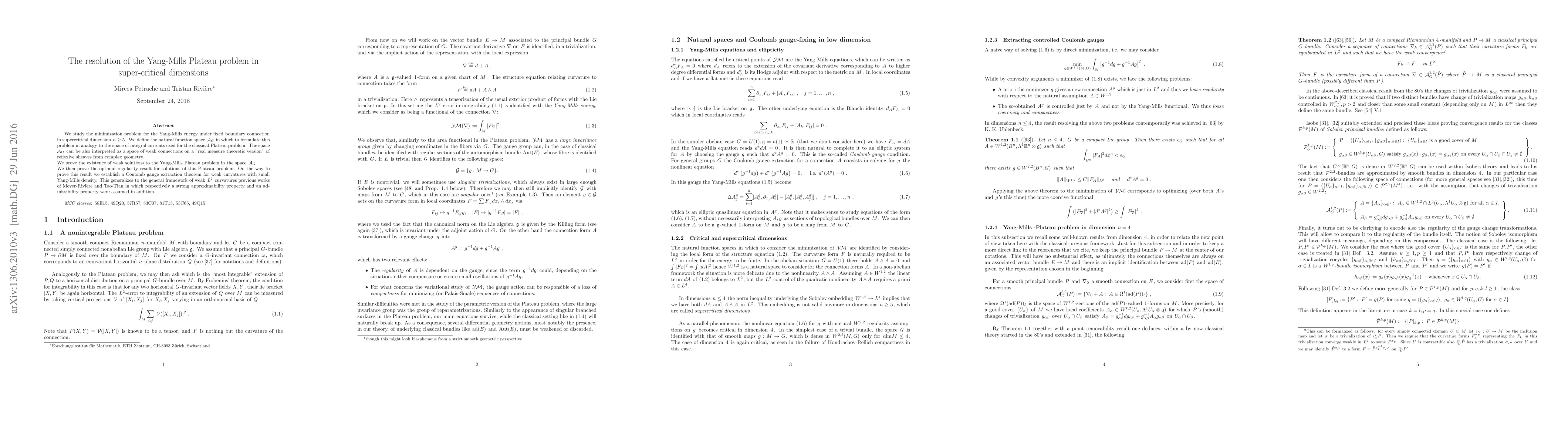 We study the minimization problem for the Yang-Mills energy under fixed boundary connection in supercritical dimension $n\geq 5$. We define the natural function space A_{G} in which to formulate this problem in analogy to the space of integral currents used for the classical Plateau problem. The space A_{G} can be also interpreted as a space of weak connections on a "real measure theoretic version" of reflexive sheaves from complex geometry. We prove the weak closure result which ensures the existence of energy-minimizing weak connections in A_{G}. We then prove that any weak connection from A_{G} can be obtained as a L^2-limit of classical connections over bundles with defects. This approximation result is then extended to a Morrey analogue. We prove the optimal regularity result for Yang-Mills local minimizers. On the way to prove this result we establish a Coulomb gauge extraction theorem for weak curvatures with small Yang-Mills density. This generalizes to the general framework of weak $L^2$ curvatures previous works of Meyer-Rivi\`ere and Tao-Tian in which respectively a strong approximability property and an admissibility property were assumed in addition.