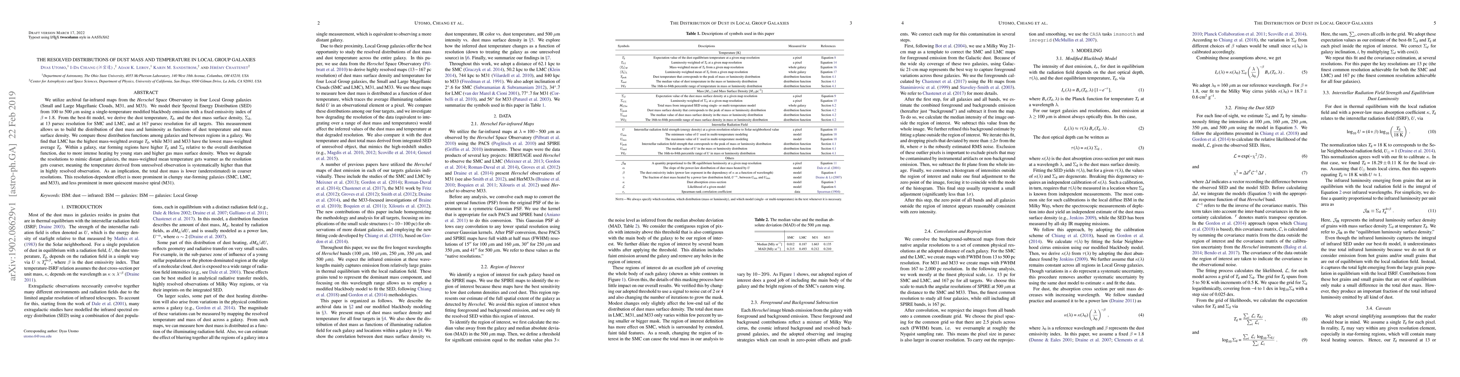 This study uses Herschel Space Observatory data to model the dust mass and temperature distributions in four Local Group galaxies, revealing that star-forming regions have higher dust temperatures and masses. The resolution-dependent effect shows that lower resolution observations underestimate dust mass and overestimate dust temperatures.