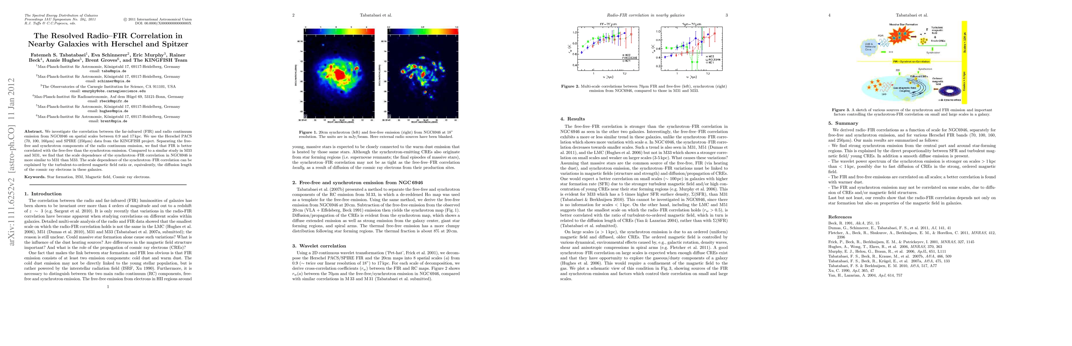 This study examines the correlation between far-infrared (FIR) and radio continuum emissions in NGC6946 using Herschel and Spitzer data, finding that FIR correlates better with free-free than synchrotron emission. The scale dependence of the synchrotron-FIR correlation in NGC6946 is more similar to M31 than M33, suggesting a link to the magnetic field structure.