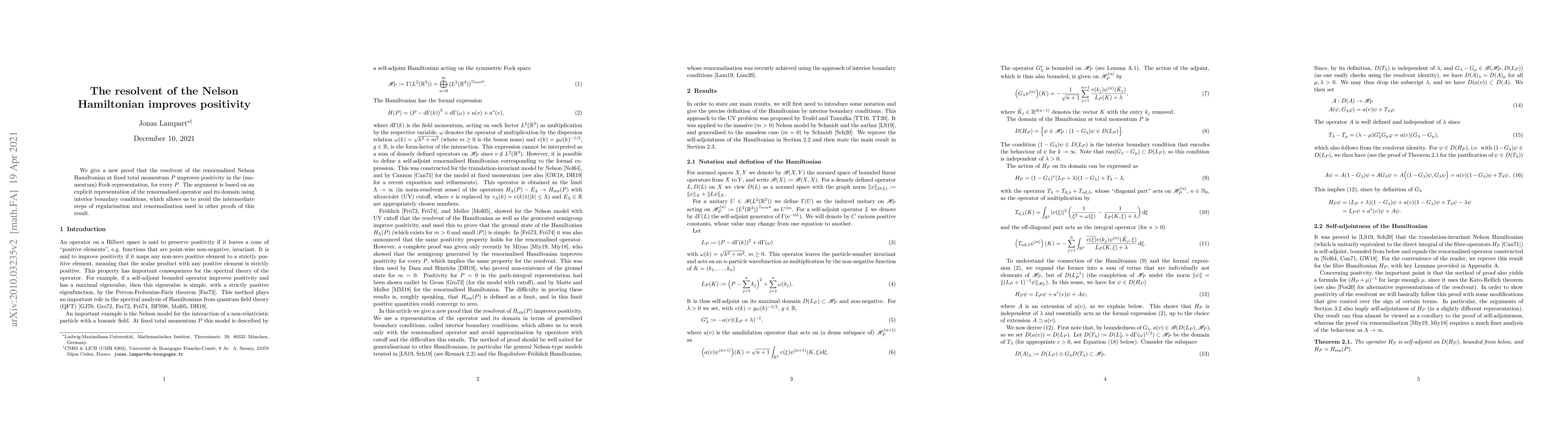 The paper presents an explicit representation of the renormalized Nelson Hamiltonian and its domain using interior boundary conditions, leading to a proof of improved positivity for its resolvent.