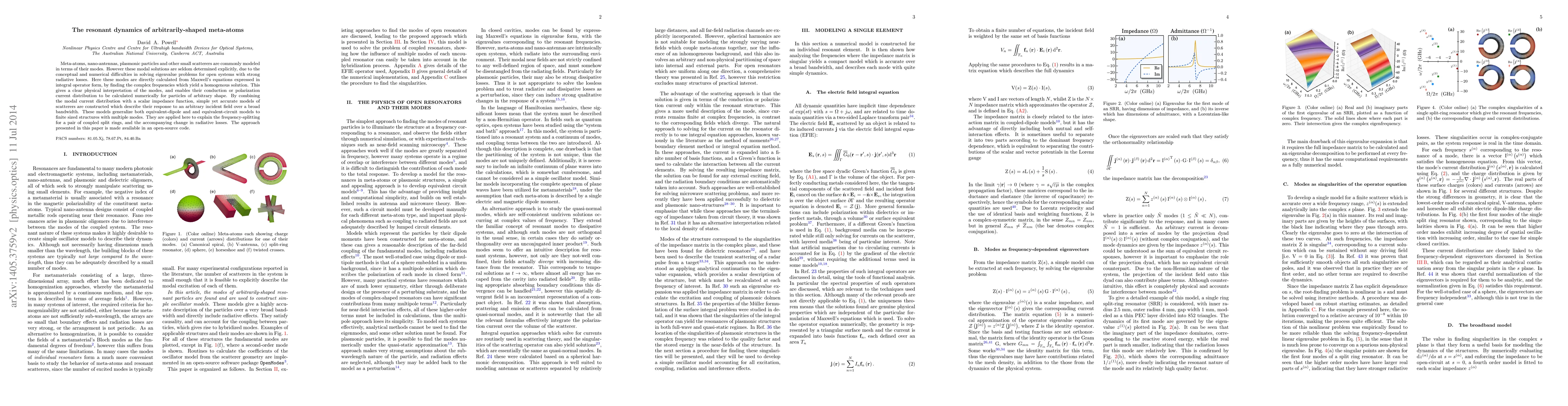 Meta-atoms, nano-antennas, plasmonic particles and other small scatterers are commonly modeled in terms of their modes. However these modal solutions are seldom determined explicitly, due to the conceptual and numerical difficulties in solving eigenvalue problems for open systems with strong radiative losses. Here these modes are directly calculated from Maxwell's equations expressed in integral operator form, by finding the complex frequencies which yield a homogenous solution. This gives a clear physical interpretation of the modes, and enables their conduction or polarization current distribution to be calculated numerically for particles of arbitrary shape. By combining the modal current distribution with a scalar impedance function, simple yet accurate models of scatterers are constructed which describe their response to an arbitrary incident field over a broad bandwidth. These models generalize both equivalent-dipole and and equivalent-circuit models to finite sized structures with multiple modes. They are applied here to explain the frequency-splitting for a pair of coupled split rings, and the accompanying change in radiative losses. The approach presented in this paper is made available in an open-source code.