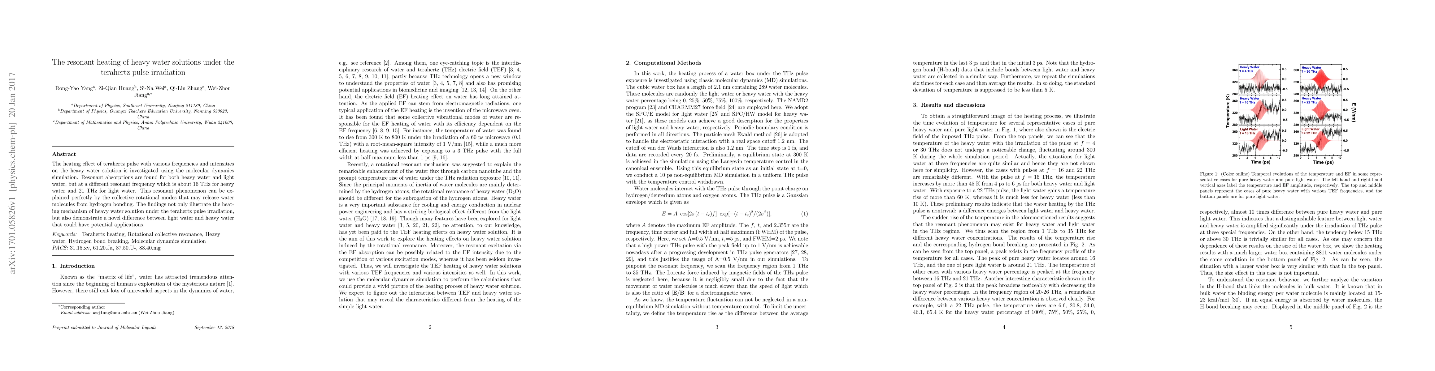 This study investigates the heating effect of terahertz pulses on heavy water solutions via molecular dynamics simulations, revealing resonant absorption at 16 THz for heavy water and 21 THz for light water due to collective rotational modes. The findings highlight a distinct heating mechanism and potential applications differentiating light and heavy water.