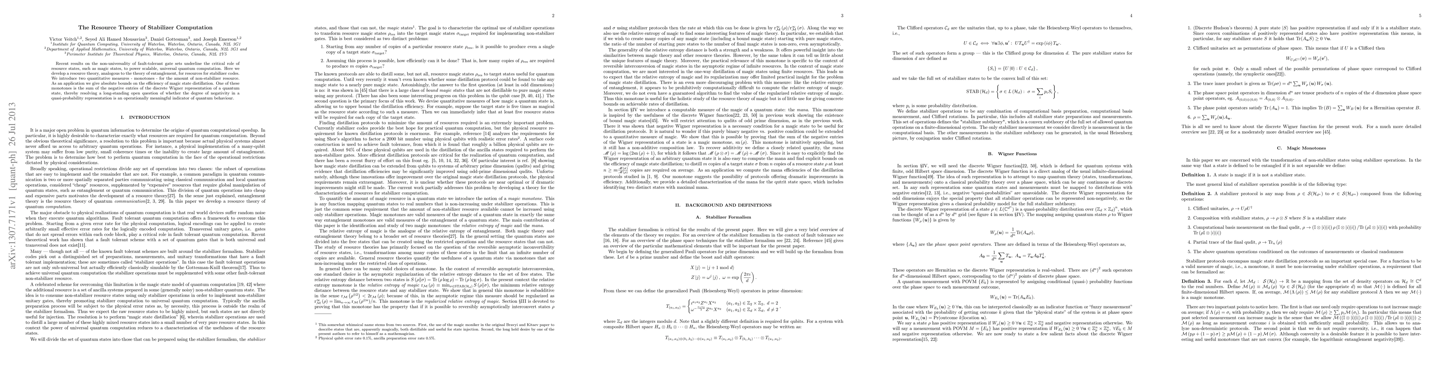 This paper develops a resource theory for stabilizer computation, introducing two quantitative measures to gauge non-stabilizer resources. It provides absolute bounds on magic state distillation efficiency and resolves the question of whether negativity in quasi-probability representations indicates quantum behavior.