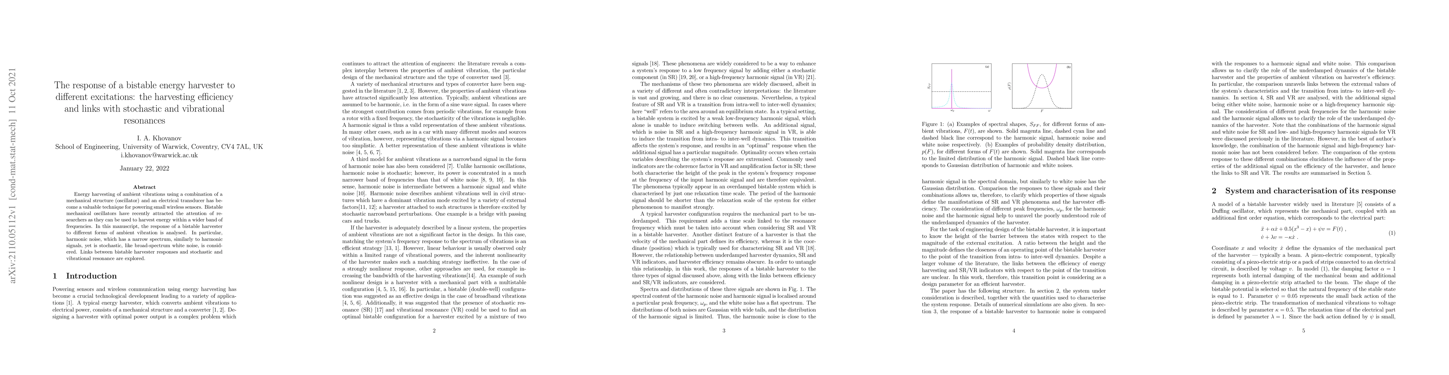 This paper investigates how a bistable energy harvester responds to various ambient vibrations, focusing on its efficiency and the connections between stochastic and vibrational resonances. It examines the performance under harmonic noise, comparing it to broader white noise, to understand the harvester's frequency band capabilities.