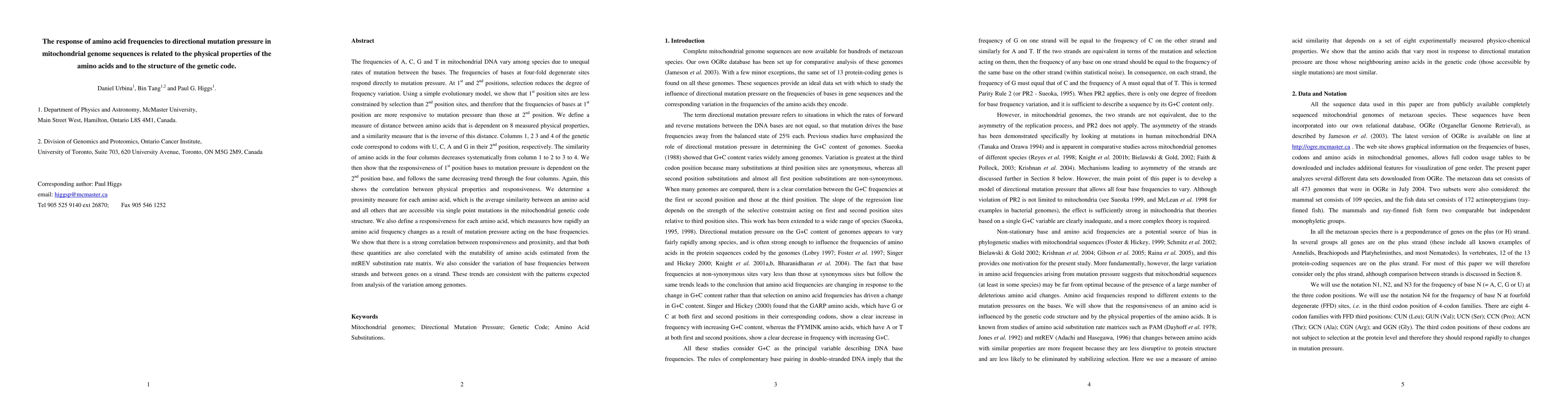 Research shows that amino acid frequencies in mitochondrial DNA respond to mutation pressure based on physical properties of amino acids and genetic code structure. Frequencies at 1st position sites are more responsive to mutation pressure than those at 2nd position sites.