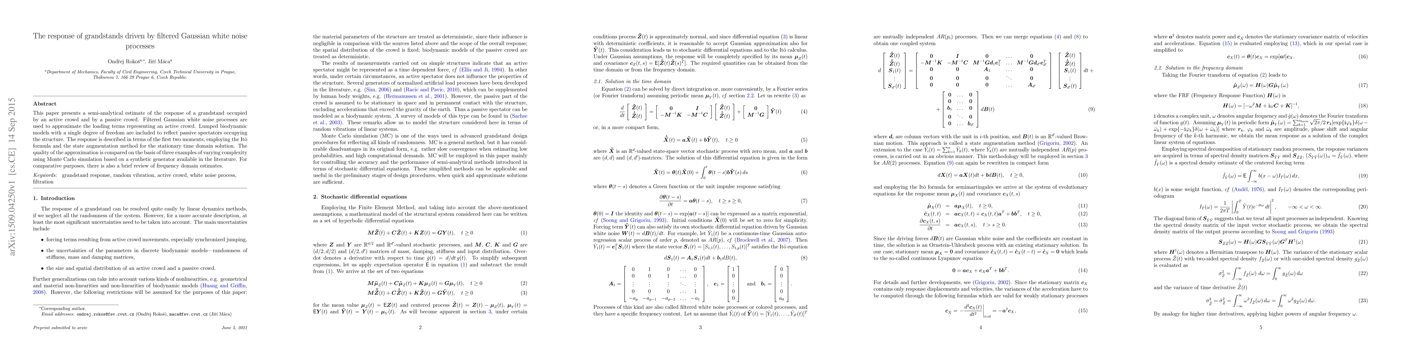 This paper presents a semi-analytical estimate of the response of a grandstand occupied by an active crowd and by a passive crowd. Filtered Gaussian white noise processes are used to approximate the loading terms representing an active crowd. Lumped biodynamic models with a single degree of freedom are included to reflect passive spectators occupying the structure. The response is described in terms of the first two moments, employing the It\^o formula and the state augmentation method for the stationary time domain solution. The quality of the approximation is compared on the basis of three examples of varying complexity using Monte Carlo simulation based on a synthetic generator available in the literature. For comparative purposes, there is also a brief review of frequency domain estimates.