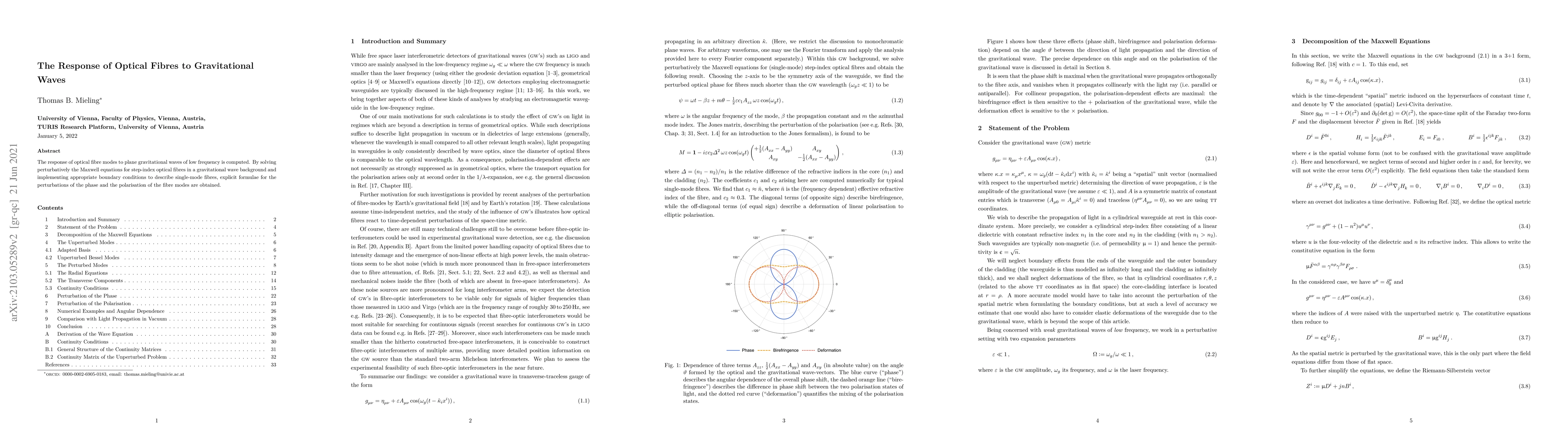 This paper computes the effects of low-frequency plane gravitational waves on the phase and polarization of optical fibre modes, deriving explicit formulae through perturbative solutions of the Maxwell equations in a gravitational wave background.