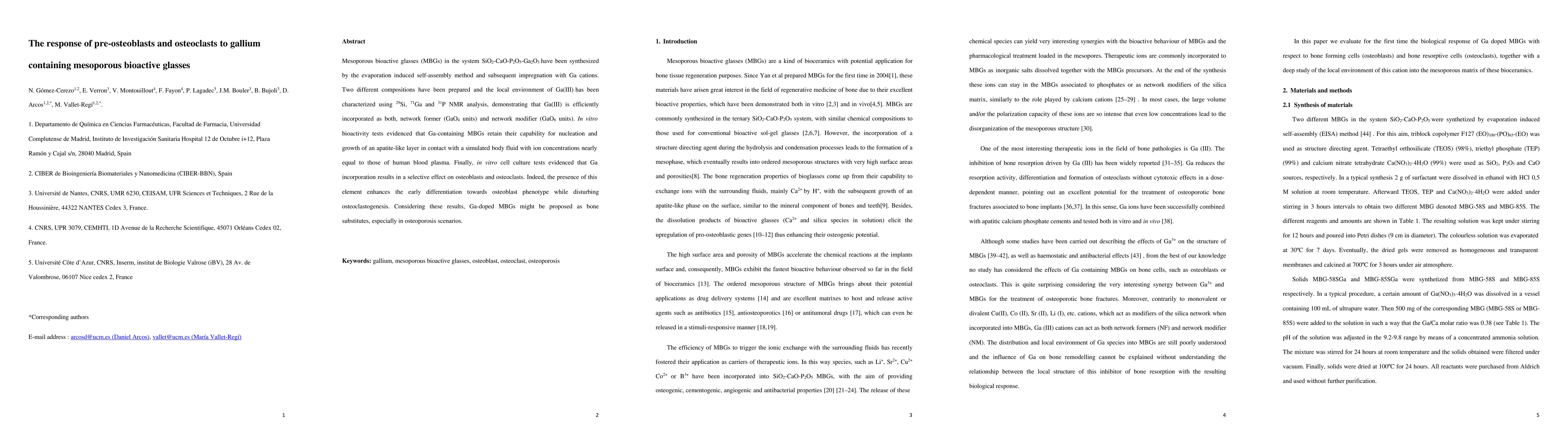Mesoporous bioactive glasses (MBGs) in the system SiO2-CaO-P2O5-Ga2O3 have been synthesized by the evaporation induced self-assembly method and subsequent impregnation with Ga cations. Two different compositions have been prepared and the local environment of Ga(III) has been characterized using 29Si, 71Ga and 31P NMR analysis, demonstrating that Ga(III) is efficiently incorporated as both, network former (GaO4 units) and network modifier (GaO6 units). In vitro bioactivity tests evidenced that Ga-containing MBGs retain their capability for nucleation and growth of an apatite-like layer in contact with a simulated body fluid with ion concentrations nearly equal to those of human blood plasma. Finally, in vitro cell culture tests evidenced that Ga incorporation results in a selective effect on osteoblasts and osteoclasts. Indeed, the presence of this element enhances the early differentiation towards osteoblast phenotype while disturbing osteoclastogenesis. Considering these results, Ga-doped MBGs might be proposed as bone substitutes, especially in osteoporosis scenarios.