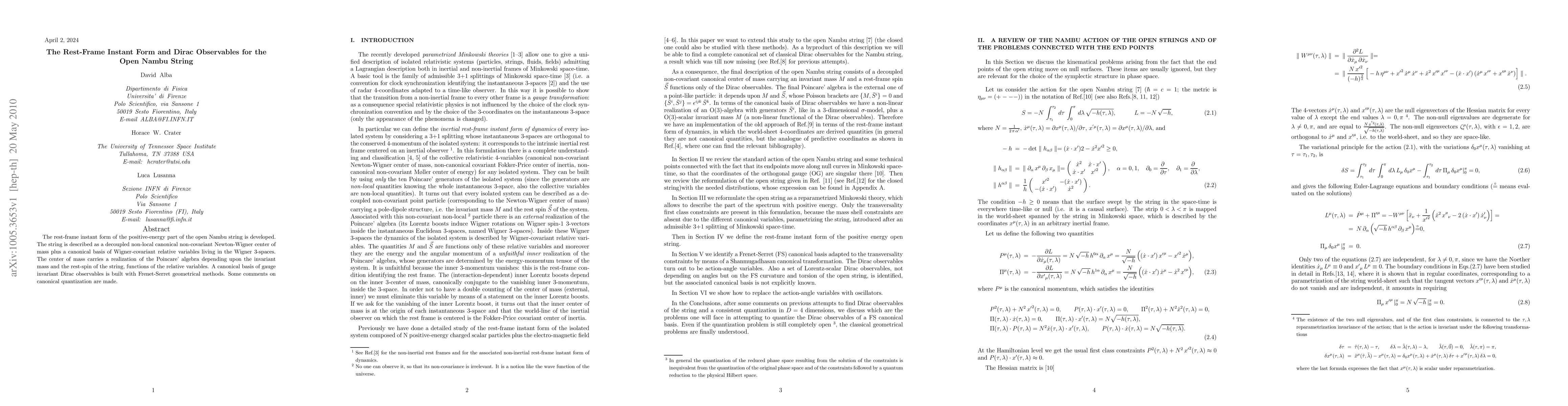 This paper develops the rest-frame instant form for the positive-energy part of the open Nambu string, describing it as a non-local canonical system with a Newton-Wigner center of mass and Wigner-covariant relative variables. It constructs a basis of gauge invariant Dirac observables using Frenet-Serret methods and briefly discusses canonical quantization.