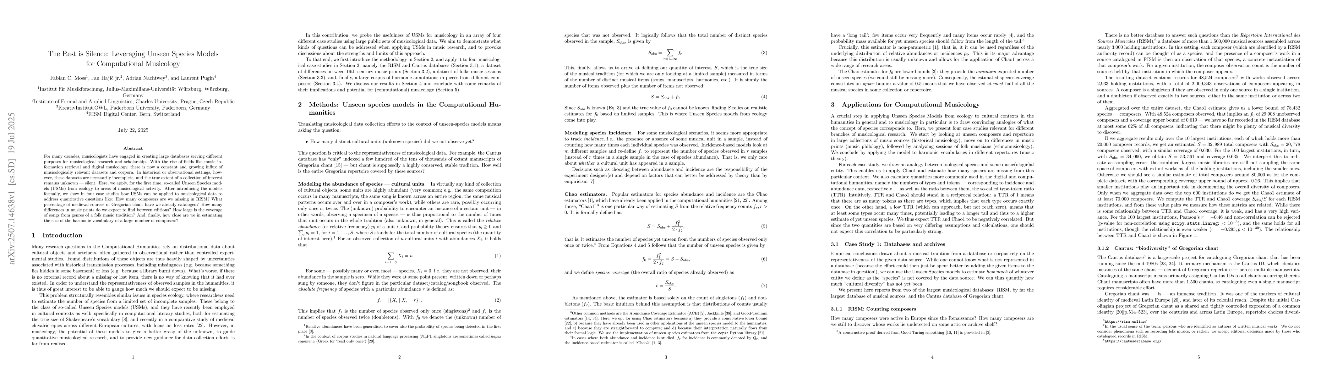 For many decades, musicologists have engaged in creating large databases serving different purposes for musicological research and scholarship. With the rise of fields like music information retrieval and digital musicology, there is now a constant and growing influx of musicologically relevant datasets and corpora. In historical or observational settings, however, these datasets are necessarily incomplete, and the true extent of a collection of interest remains unknown -- silent. Here, we apply, for the first time, so-called Unseen Species models (USMs) from ecology to areas of musicological activity. After introducing the models formally, we show in four case studies how USMs can be applied to musicological data to address quantitative questions like: How many composers are we missing in RISM? What percentage of medieval sources of Gregorian chant have we already cataloged? How many differences in music prints do we expect to find between editions? How large is the coverage of songs from genres of a folk music tradition? And, finally, how close are we in estimating the size of the harmonic vocabulary of a large number of composers?