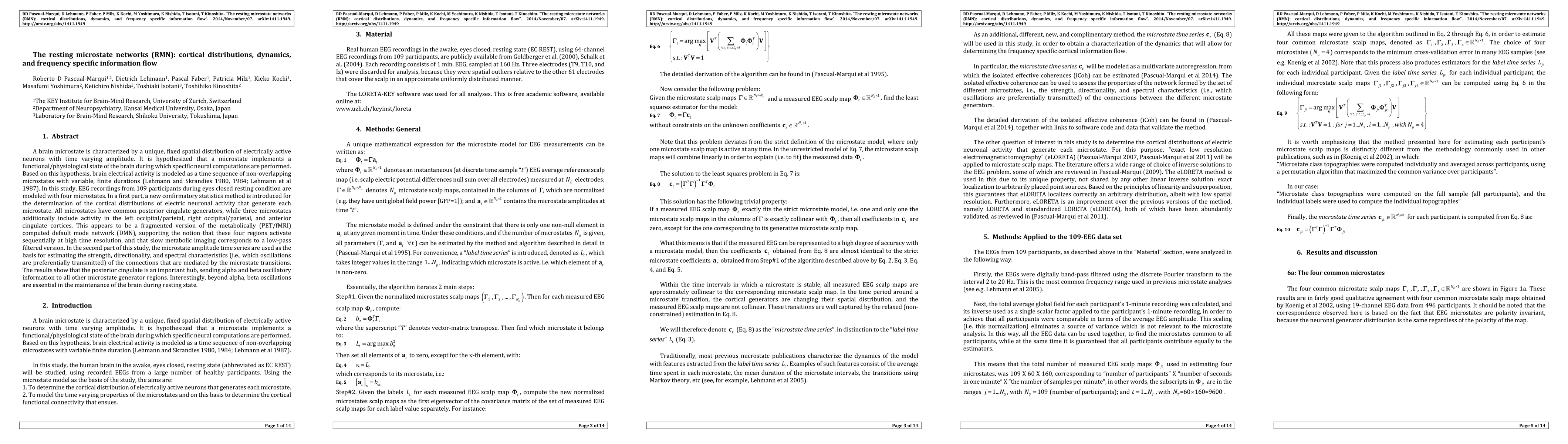 A brain microstate is characterized by a unique, fixed spatial distribution of electrically active neurons with time varying amplitude. It is hypothesized that a microstate implements a functional/physiological state of the brain during which specific neural computations are performed. Based on this hypothesis, brain electrical activity is modeled as a time sequence of non-overlapping microstates with variable, finite durations (Lehmann and Skrandies 1980, 1984; Lehmann et al 1987). In this study, EEG recordings from 109 participants during eyes closed resting condition are modeled with four microstates. In a first part, a new confirmatory statistics method is introduced for the determination of the cortical distributions of electric neuronal activity that generate each microstate. All microstates have common posterior cingulate generators, while three microstates additionally include activity in the left occipital/parietal, right occipital/parietal, and anterior cingulate cortices. This appears to be a fragmented version of the metabolically (PET/fMRI) computed default mode network (DMN), supporting the notion that these four regions activate sequentially at high time resolution, and that slow metabolic imaging corresponds to a low-pass filtered version. In the second part of this study, the microstate amplitude time series are used as the basis for estimating the strength, directionality, and spectral characteristics (i.e., which oscillations are preferentially transmitted) of the connections that are mediated by the microstate transitions. The results show that the posterior cingulate is an important hub, sending alpha and beta oscillatory information to all other microstate generator regions. Interestingly, beyond alpha, beta oscillations are essential in the maintenance of the brain during resting state.