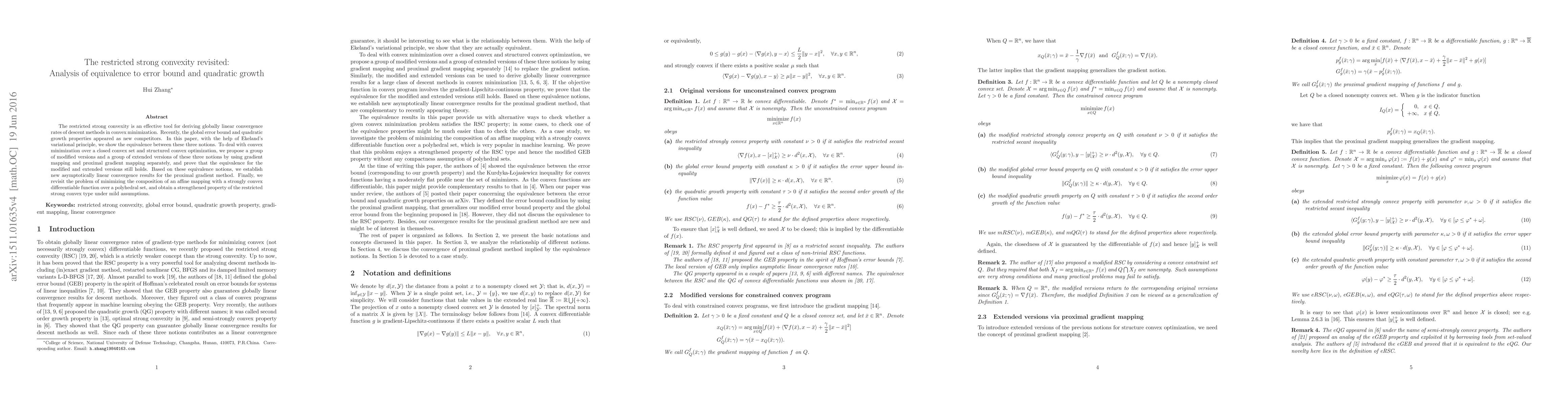 This paper proves the equivalence between restricted strong convexity, error bound, and quadratic growth in convex minimization, establishing new convergence results for the proximal gradient method and strengthening restricted strong convexity under mild assumptions.