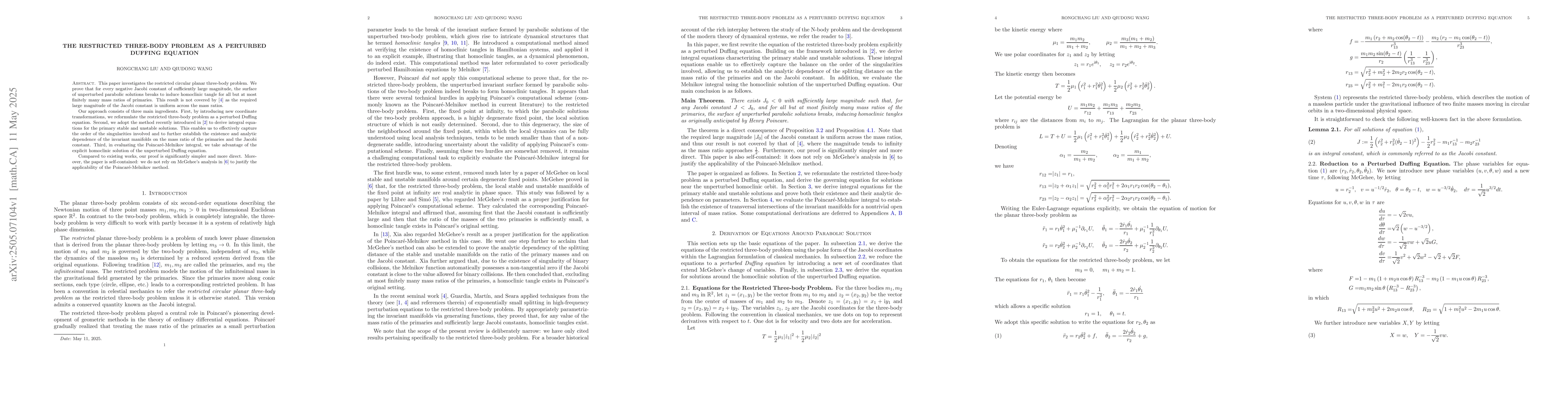 The paper presents a novel method to prove the existence and analytic dependence of invariant manifolds in the restricted three-body problem using a perturbed Duffing equation formulation.