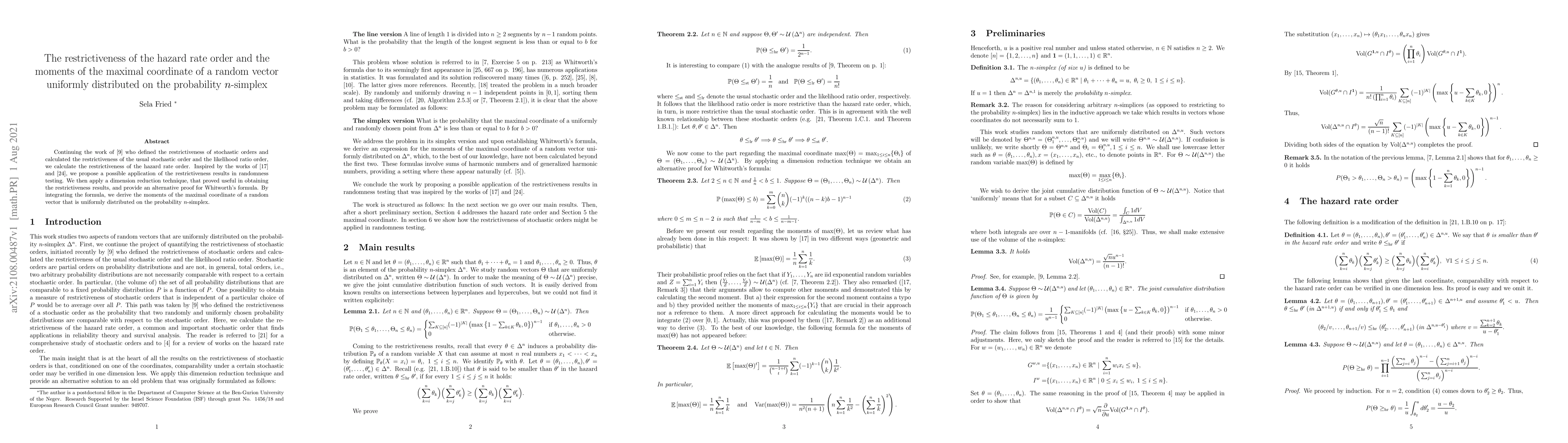Researchers calculate the restrictiveness of the hazard rate order for a uniform random vector on an n-simplex, providing insights into randomness testing and deriving moments of the maximal coordinate.