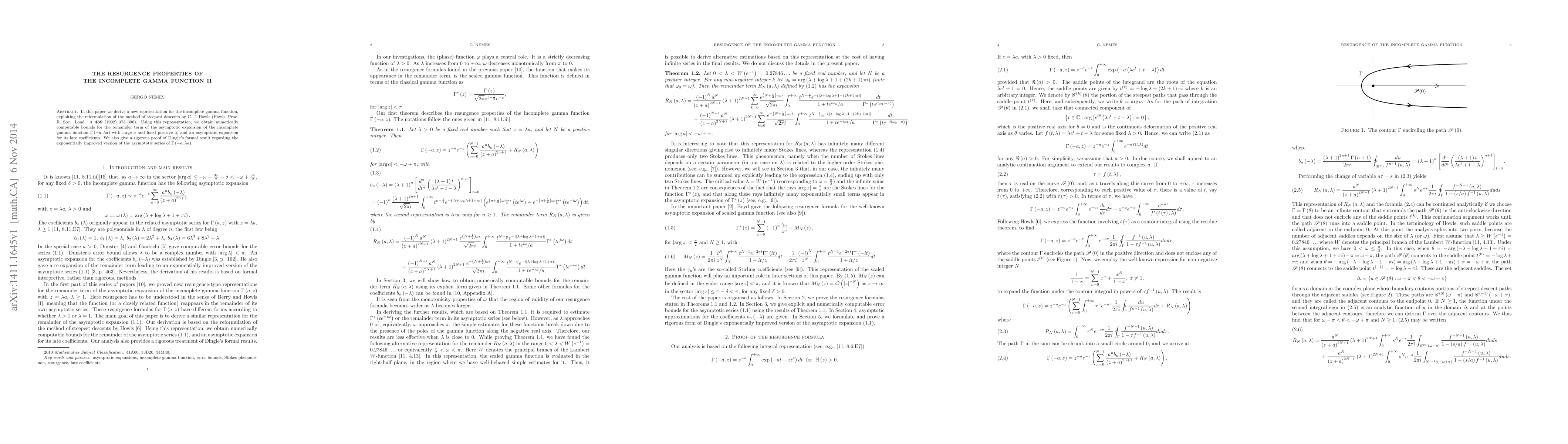 This paper presents a new representation for the incomplete gamma function using C. J. Howls' reformulated method of steepest descents, which allows for numerically computable bounds on the remainder term and an asymptotic expansion for its late coefficients. It also rigorously proves Dingle's result on the exponentially improved asymptotic series for $\Gamma \left( { - a,\lambda a} \right)$.