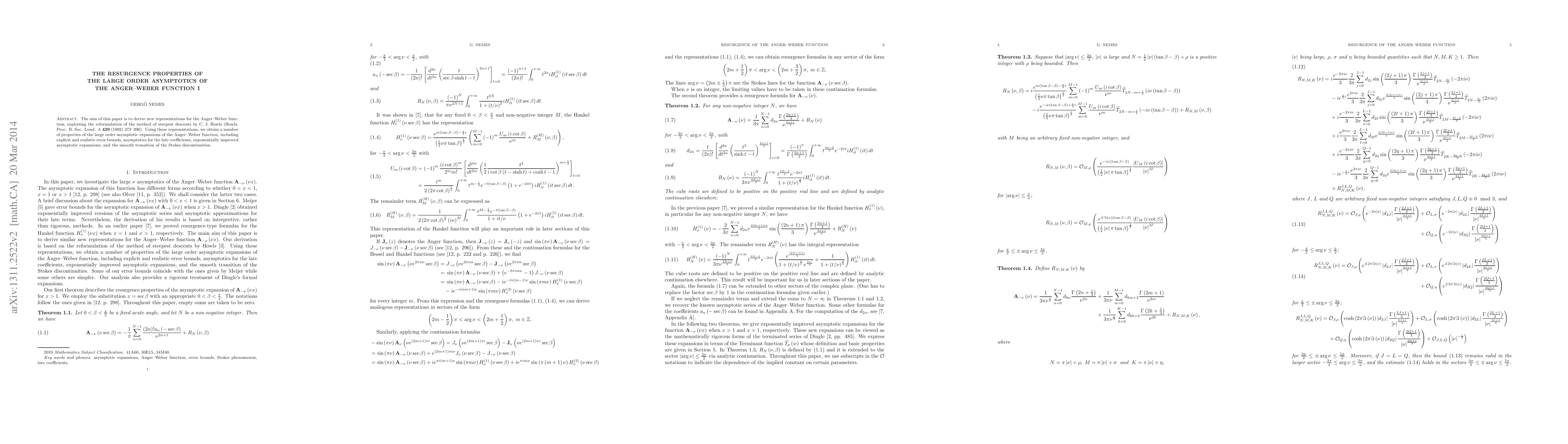 The aim of this paper is to derive new representations for the Anger--Weber function, exploiting the reformulation of the method of steepest descents by C. J. Howls (Howls, Proc. R. Soc. Lond. A 439 (1992) 373--396). Using these representations, we obtain a number of properties of the large order asymptotic expansions of the Anger--Weber function, including explicit and realistic error bounds, asymptotics for the late coefficients, exponentially improved asymptotic expansions, and the smooth transition of the Stokes discontinuities.