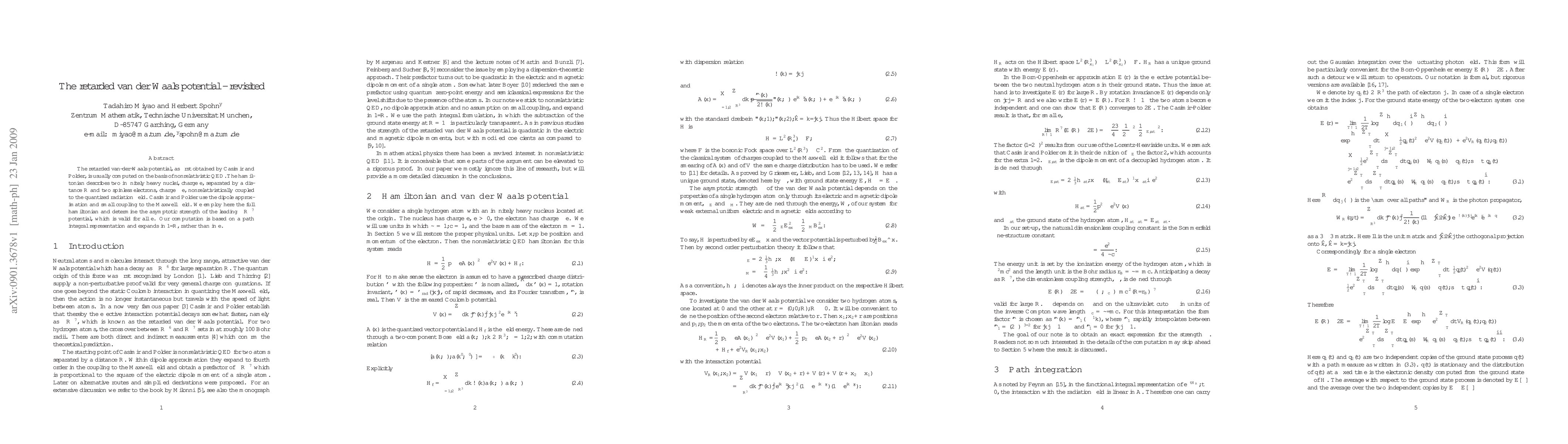 The retarded van-der-Waals potential, as first obtained by Casimir and Polder, is usually computed on the basis of nonrelativistic QED. The hamiltonian describes two infinitely heavy nuclei, charge $e$, separated by a distance $R$ and two spinless electrons, charge $-e$, nonrelativistically coupled to the quantized radiation field. Casimir and Polder use the dipole approximation and small coupling to the Maxwell field. We employ here the full hamiltonian and determine the asymptotic strength of the leading $-R^{-7}$ potential, which is valid for all $e$. Our computation is based on a path integral representation and expands in $1/R$, rather than in $e$.