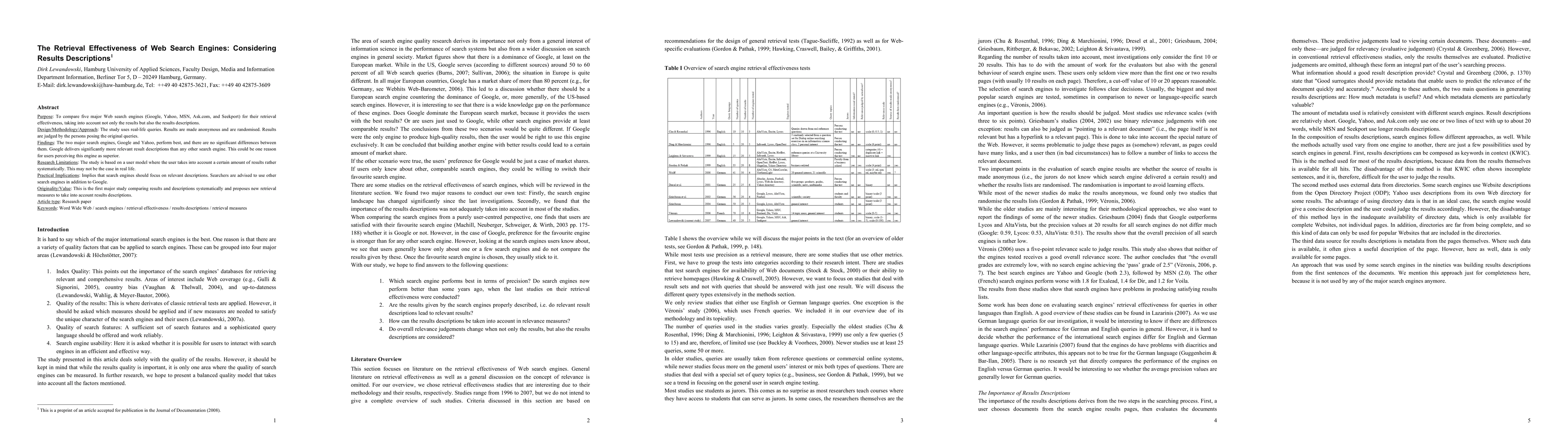 Purpose: To compare five major Web search engines (Google, Yahoo, MSN, Ask.com, and Seekport) for their retrieval effectiveness, taking into account not only the results but also the results descriptions. Design/Methodology/Approach: The study uses real-life queries. Results are made anonymous and are randomised. Results are judged by the persons posing the original queries. Findings: The two major search engines, Google and Yahoo, perform best, and there are no significant differences between them. Google delivers significantly more relevant result descriptions than any other search engine. This could be one reason for users perceiving this engine as superior. Research Limitations: The study is based on a user model where the user takes into account a certain amount of results rather systematically. This may not be the case in real life. Practical Implications: Implies that search engines should focus on relevant descriptions. Searchers are advised to use other search engines in addition to Google. Originality/Value: This is the first major study comparing results and descriptions systematically and proposes new retrieval measures to take into account results descriptions