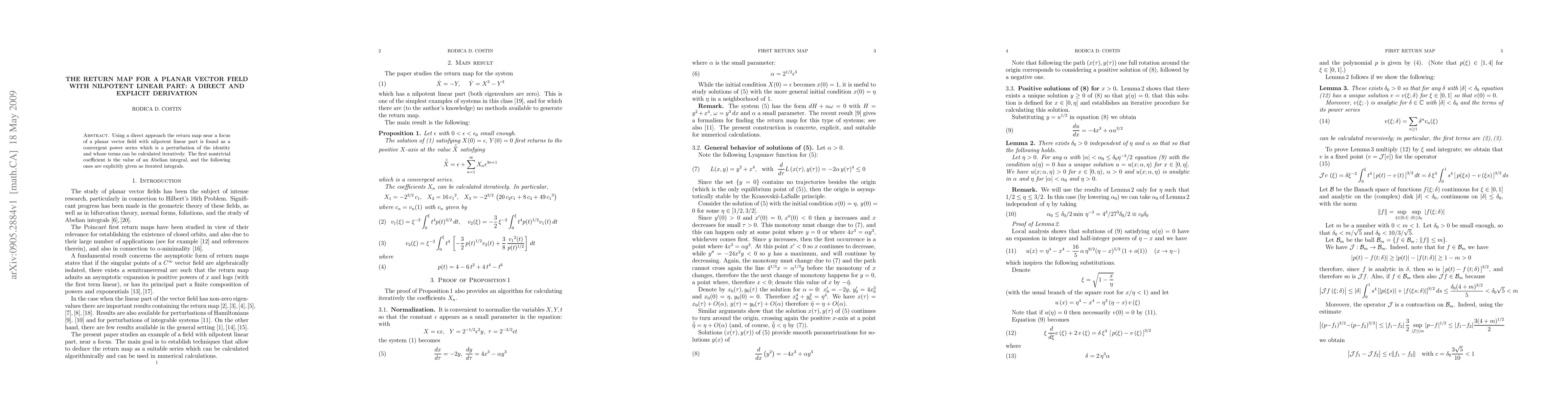 This paper derives a direct return map for a planar vector field near a focus with a nilpotent linear part, presenting it as a convergent power series perturbation of the identity. The first nontrivial coefficient is determined by an Abelian integral, with subsequent coefficients given as iterated integrals.