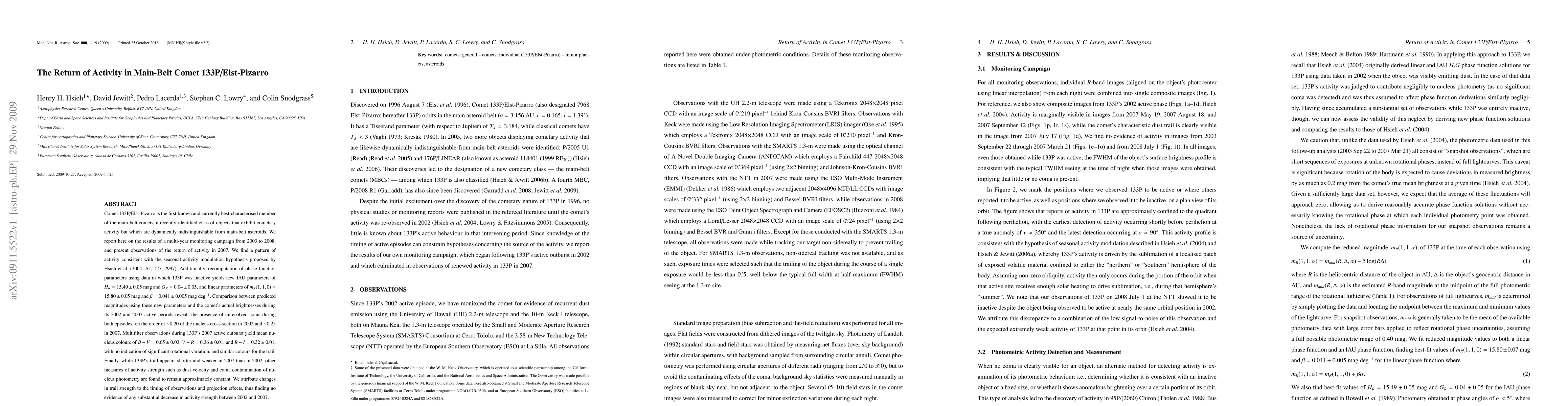 The research monitors main-belt comet 133P/Elst-Pizarro from 2003-2008, confirming seasonal activity modulation. It updates IAU parameters and reveals unresolved coma in 2002 and 2007, with consistent nucleus colors and activity measures, suggesting no significant decrease in activity strength between the observed periods.