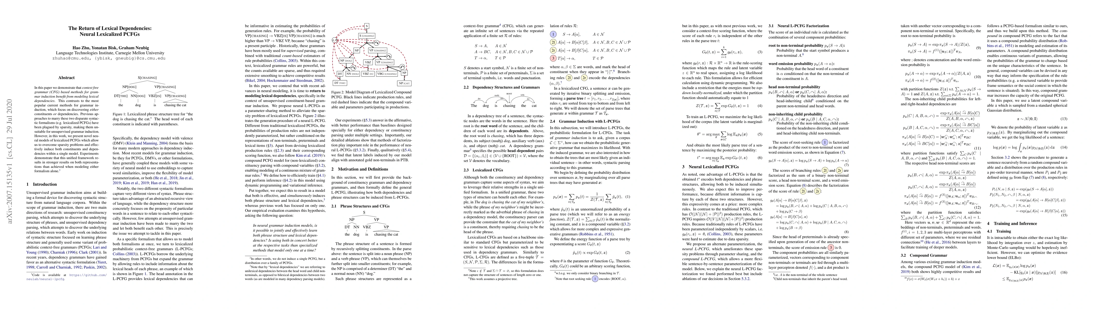 This paper proposes neural lexicalized Probabilistic Context Free Grammars (PCFGs) to effectively model both syntactic constituents and lexical dependencies, overcoming sparsity issues that plague traditional methods. Experimental results show improved performance compared to methods that model either constituents or dependencies alone.