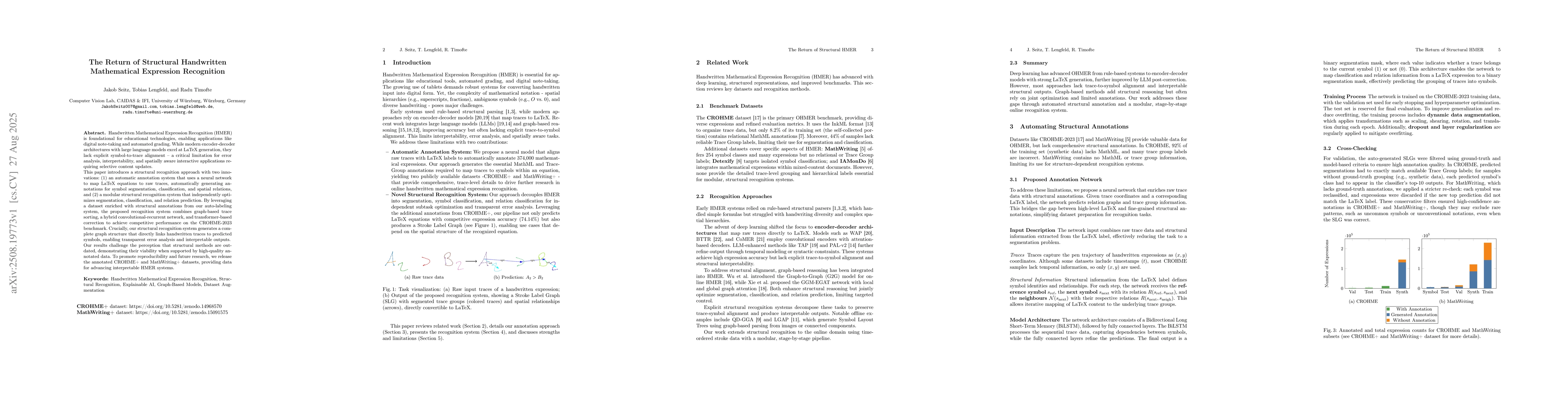Handwritten Mathematical Expression Recognition is foundational for educational technologies, enabling applications like digital note-taking and automated grading. While modern encoder-decoder architectures with large language models excel at LaTeX generation, they lack explicit symbol-to-trace alignment, a critical limitation for error analysis, interpretability, and spatially aware interactive applications requiring selective content updates. This paper introduces a structural recognition approach with two innovations: 1 an automatic annotation system that uses a neural network to map LaTeX equations to raw traces, automatically generating annotations for symbol segmentation, classification, and spatial relations, and 2 a modular structural recognition system that independently optimizes segmentation, classification, and relation prediction. By leveraging a dataset enriched with structural annotations from our auto-labeling system, the proposed recognition system combines graph-based trace sorting, a hybrid convolutional-recurrent network, and transformer-based correction to achieve competitive performance on the CROHME-2023 benchmark. Crucially, our structural recognition system generates a complete graph structure that directly links handwritten traces to predicted symbols, enabling transparent error analysis and interpretable outputs.