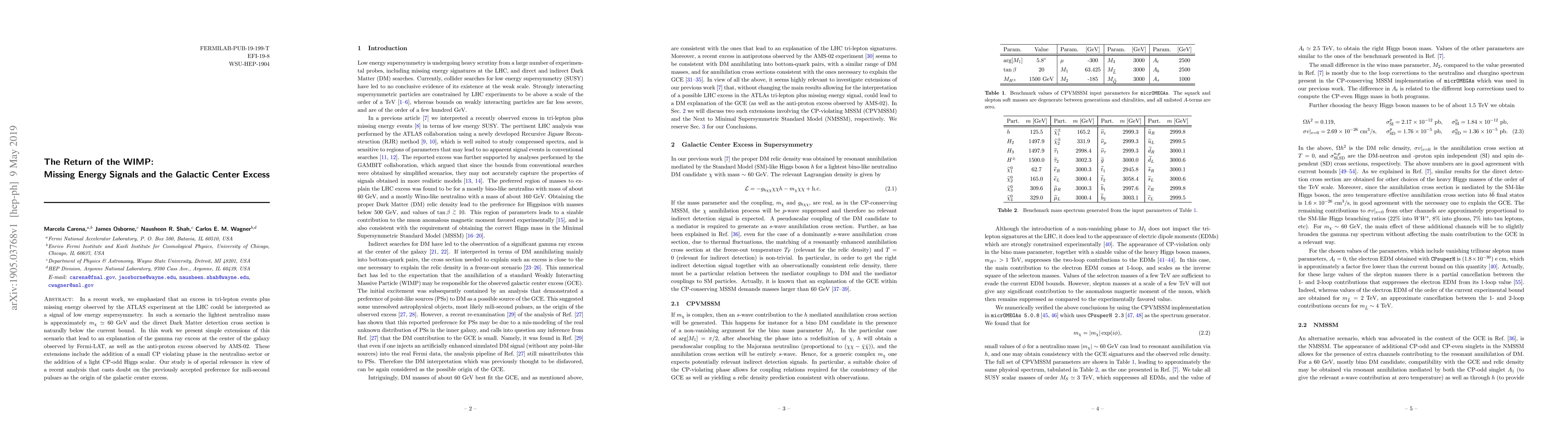 In a recent work, we emphasized that an excess in tri-lepton events plus missing energy observed by the ATLAS experiment at the LHC could be interpreted as a signal of low energy supersymmetry. In such a scenario the lightest neutralino mass is approximately $m_\chi \simeq 60$ GeV and the direct Dark Matter detection cross section is naturally below the current bound. In this work we present simple extensions of this scenario that lead to an explanation of the gamma ray excess at the center of the galaxy observed by Fermi-LAT, as well as the anti-proton excess observed by AMS-02. These extensions include the addition of a small CP violating phase in the neutralino sector or the addition of a light CP-odd Higgs scalar. Our study is of special relevance in view of a recent analysis that casts doubt on the previously accepted preference for mili-second pulsars as the origin of the galactic center excess.