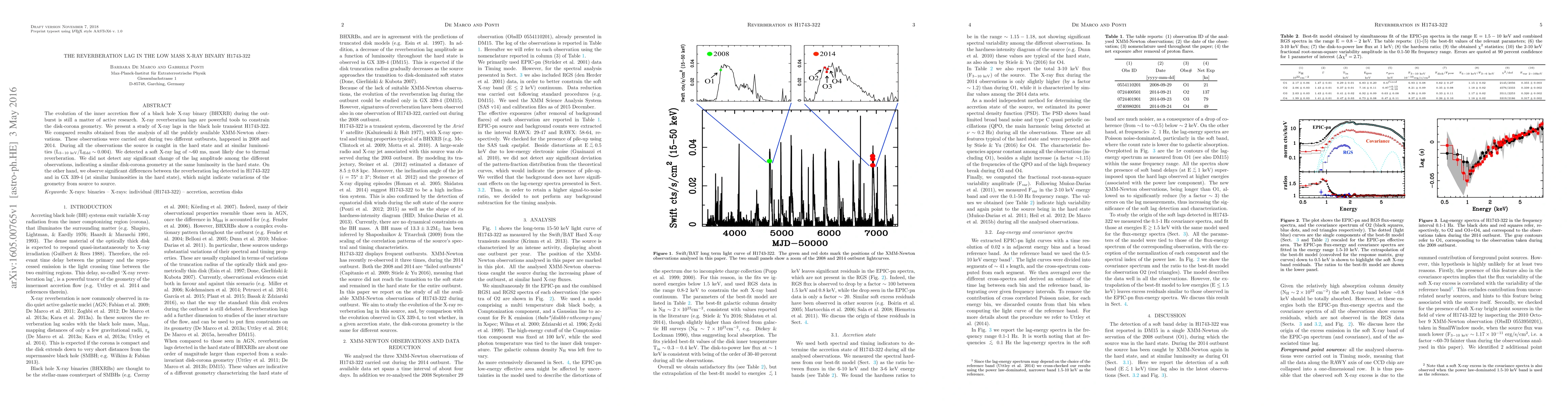 The evolution of the inner accretion flow of a black hole X-ray binary (BHXRB) during the outburst is still a matter of active research. X-ray reverberation lags are powerful tools to constrain the disk-corona geometry. We present a study of X-ray lags in the black hole transient H1743-322. We compared results obtained from the analysis of all the publicly available XMM-Newton observations. These observations were carried out during two different outbursts, happened in 2008 and 2014. During all the observations the source is caught in the hard state and at similar luminosities ($\mathrm{L_{3-10\ keV}/L_{Edd}\sim 0.004}$). We detected a soft X-ray lag of $\sim$60 ms, most likely due to thermal reverberation. We did not detect any significant change of the lag amplitude among the different observations, indicating a similar disk-corona geometry at the same luminosity in the hard state. On the other hand, we observe significant differences between the reverberation lag detected in H1743-322 and in GX 339-4 (at similar luminosities in the hard state), which might indicate variations of the geometry from source to source.